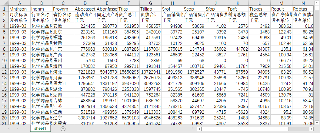 月度标识 行业名称 省份名称 流动资产平均余额 固定资产净值平均余额 资产总计 负债合计 产品销售收入 产品销售成本 产品销售费用 利润总额 税金总额 资产净值增长率(%) 资产负债率(%) 流动资产周转速度 人均销售额