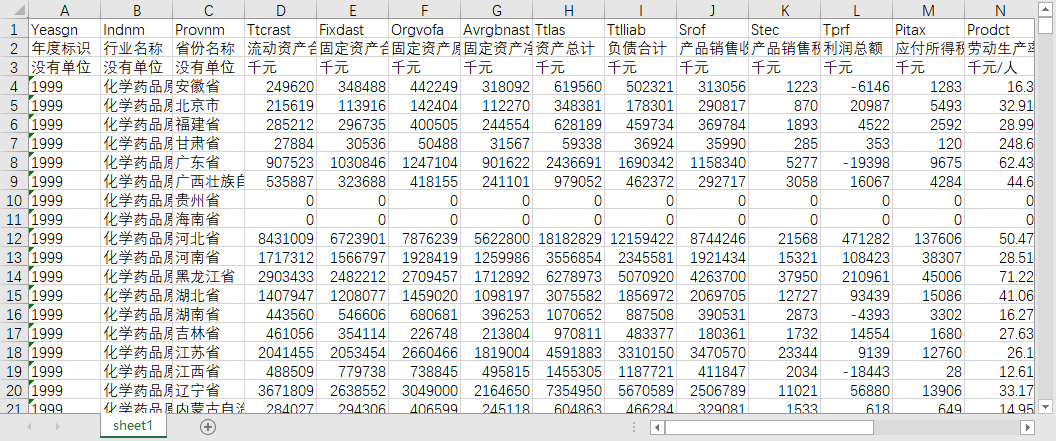 年度标识 行业名称 省份名称 流动资产合计 固定资产合计 固定资产原价 固定资产净值平均余额 资产总计 负债合计 产品销售收入 产品销售税金及附加 利润总额 应付所得税 劳动生产率 流动资产周转率 销售利润率(%) 应收账款周转率 资产负债率(%) 资产利润率(%) 总资产贡献率(%) 资产周转率 成本费用利润率(%)
