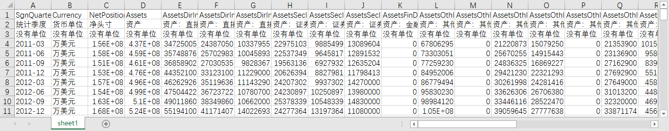 统计季度 货币单位 净头寸 资产 资产:直接投资 资产:直接投资:股权 资产:直接投资:关联企业债务 资产:证券投资 资产:证券投资:股权 资产:证券投资:债券 资产:金融衍生工具 资产:其他投资 资产:其他投资:其他股权 资产:其他投资:货币和存款 资产:其他投资:贷款 资产:其他投资:保险和养老金 资产:其他投资:贸易信贷 资产:其他投资:其他 资产:储备资产 资产:储备资产:货币黄金 资产:储备资产:特别提款权 资产:储备资产:在国际货币基金组织的储备头寸 资产:储备资产:外汇储备 资产:储备资产:其他储备资产 负债 负债:直接投资 负债:直接投资:股权 负债:直接投资:关联企业债务 负债:证券投资 负债:证券投资:股权 负债:证券投资:债券 负债:金融衍生工具 负债:其他投资 负债:其他投资:其他股权 负债:其他投资:货币和存款 负债:其他投资:贷款 负债:其他投资:保险和养老金 负债:其他投资:贸易信贷 负债:其他投资:其他 负债:其他投资:特别提款权