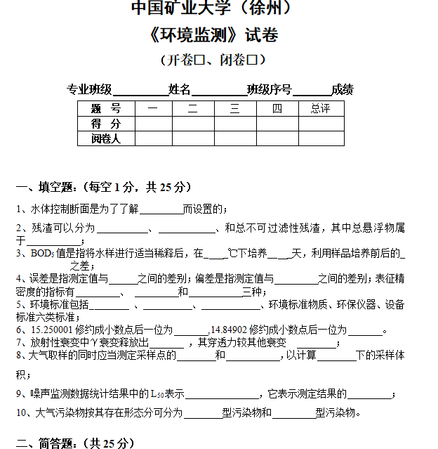 矿大中国矿业大学徐州环境监测期末试卷及答案