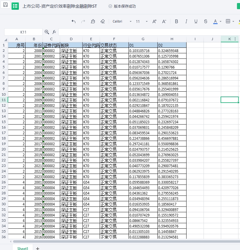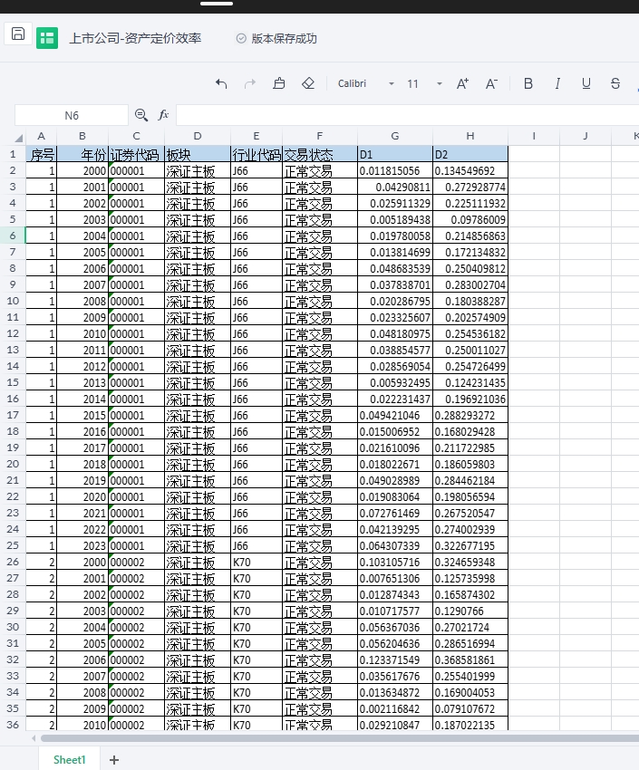 包含指标:序号、年份、证券代码、板块、行业代码、交易状态、D1、D2。