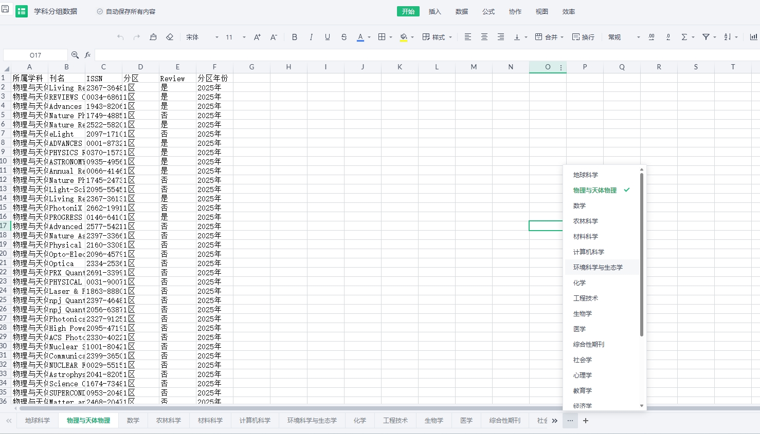数据简介:期刊分区表是用于评估学术期刊影响力和学术水平的重要工具,通常按照期刊的影响因子或引证指标将其划分为若干等级(中科院分区为一区、二区、三区、四区)。该表广泛应用于科研评价、论文投稿选择和项目申报中,帮助研究人员识别所在学科领域内具有较高影响力的期刊,从而提升学术成果的认可度和传播。本文为期刊分区表2025年全名单分区数据,包括SCIE、SSCI、A&HCI、ESCI和OAJ,共设置了包括自然科学、社会科学和人文科学在内的21个大类。