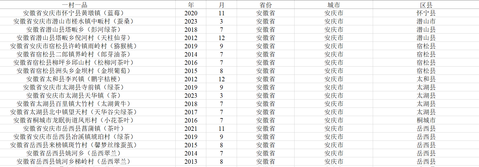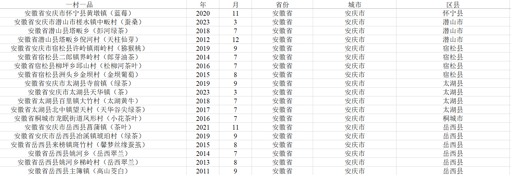 ”所在省份、城市、区县(不包括新疆生产建设兵团)。本数据可用于统计城市层面或区县层面“一村一品”数量,以及利用双重差分法进行政策效应评价。