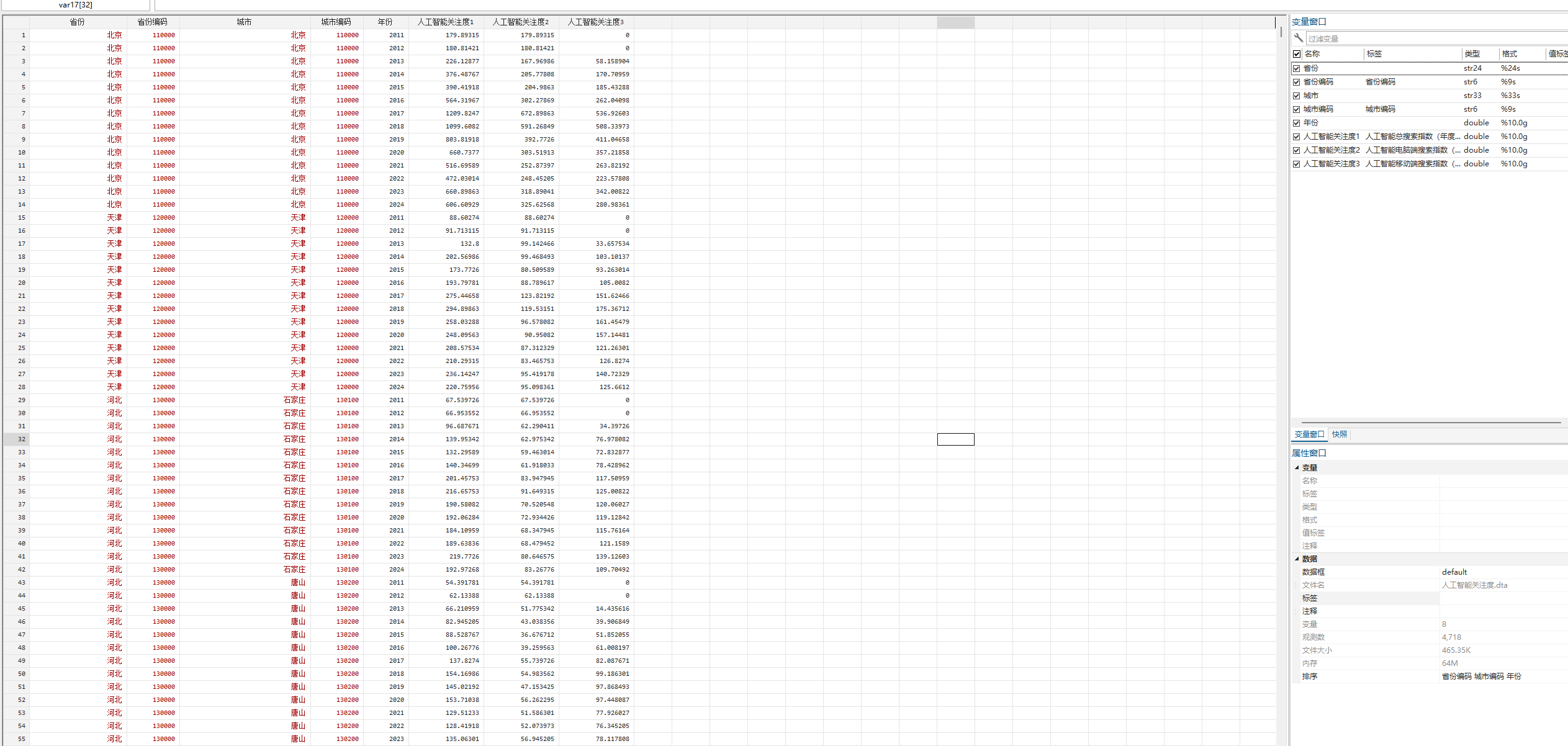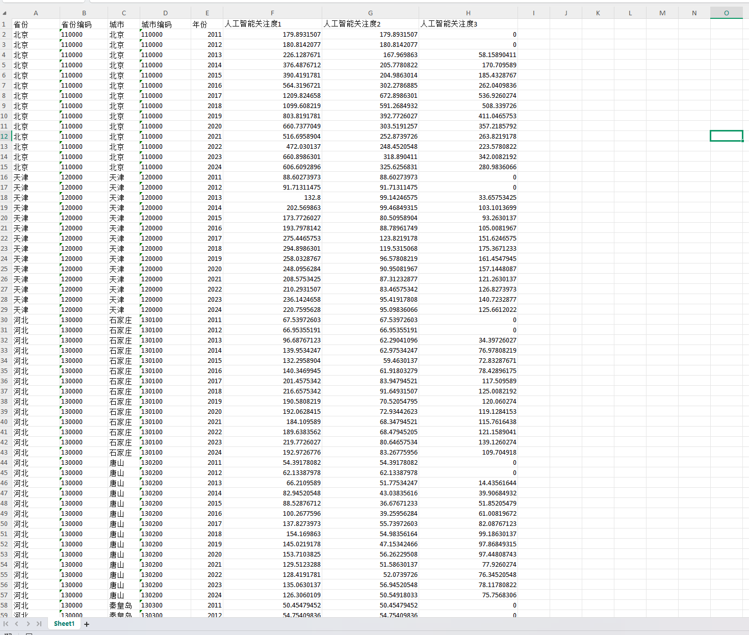 注意:人工智能关注度3的原始数据在2011、2012年均存在大量0值,因此在分析时可选择不使用2011、2012年数据。本指标在参者文献中仅作为综合指标的组成部分使用,并不是主变量。