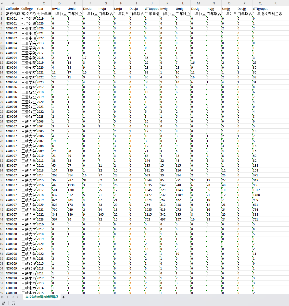 ▪ 综合评价: 通过对高校专利申请与授权情况的分析,能够精准洞察各高校在不同专利类型(发明、实用新型、外观设计)上的创新侧重与活跃度。这对于研究高校科技创新战略布局、学科发展优势以及产学研合作成效等学术方向意义非凡。在学术研究中,可基于此数据探究高校科研产出与区域经济发展的关联,挖掘不同地区高校创新能力差异的成因,也能用于评估高校科研管理政策对专利成果的影响,助力高校优化科研资源配置,提升整体创新水平 。