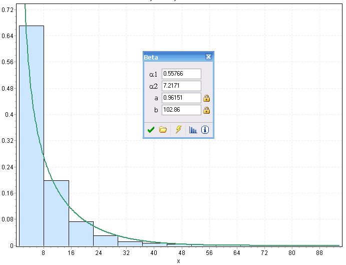 nkunku 发表于 2012-6-19 14:17 对直径数据拟合了好多种分布,发现Beta分布是最好的。得到的参数见截图。其他问题不清楚。向其他高手请教吧 ...