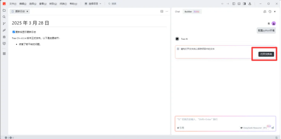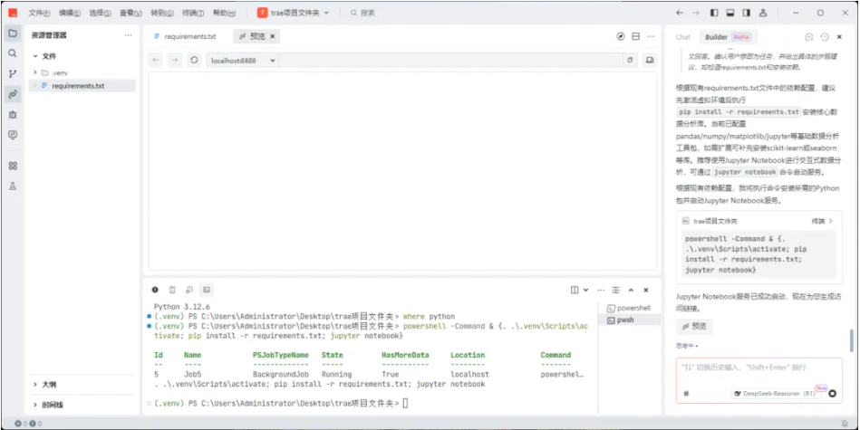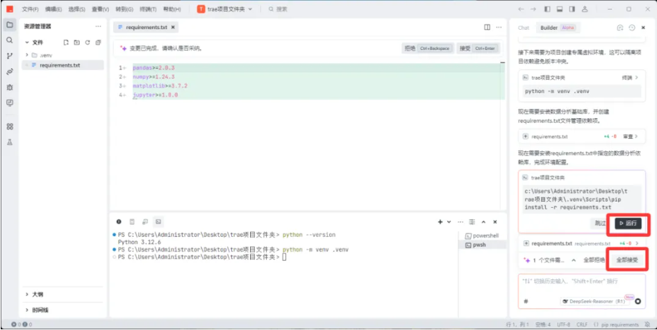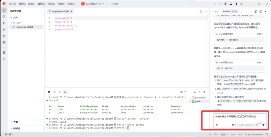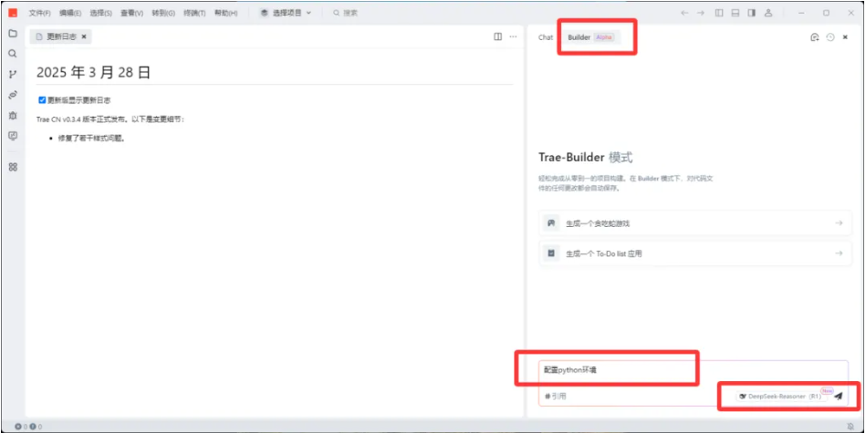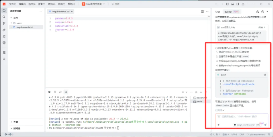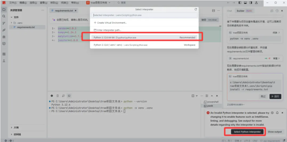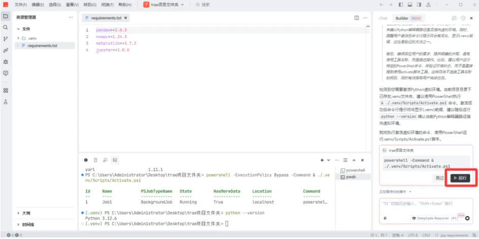 1)在Builder模式下,输入提示词:配置python环境。