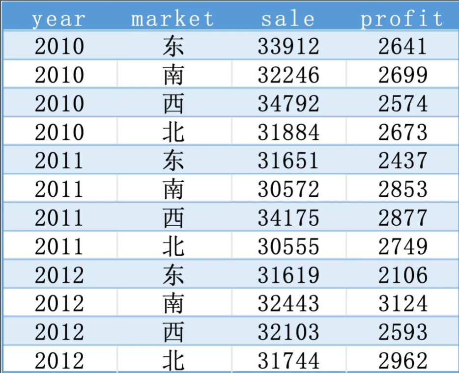 现有如下几张数据表,记录了不同年份,不同区域市场的销售金额及利润情况,现需要多张表合并为一张表。