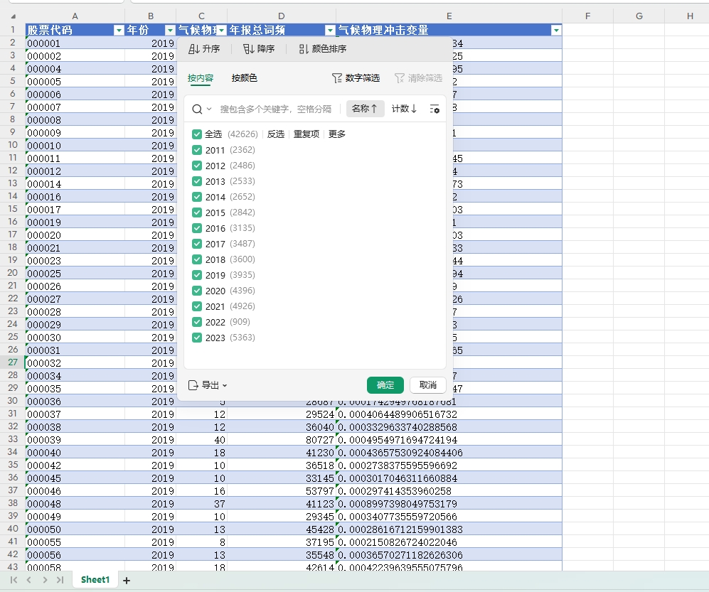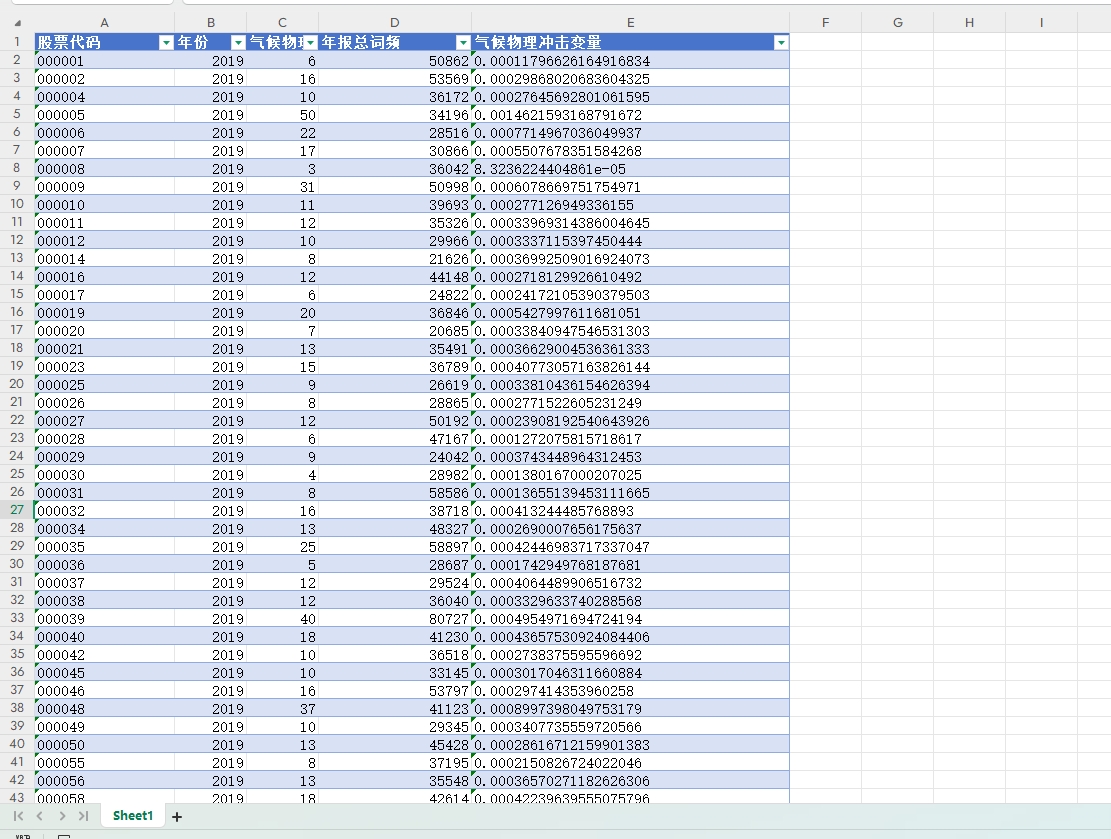 | 股票代码 | 年份 | 气候物理冲击词频 | 年报总词频 | 气候物理冲击变量 |