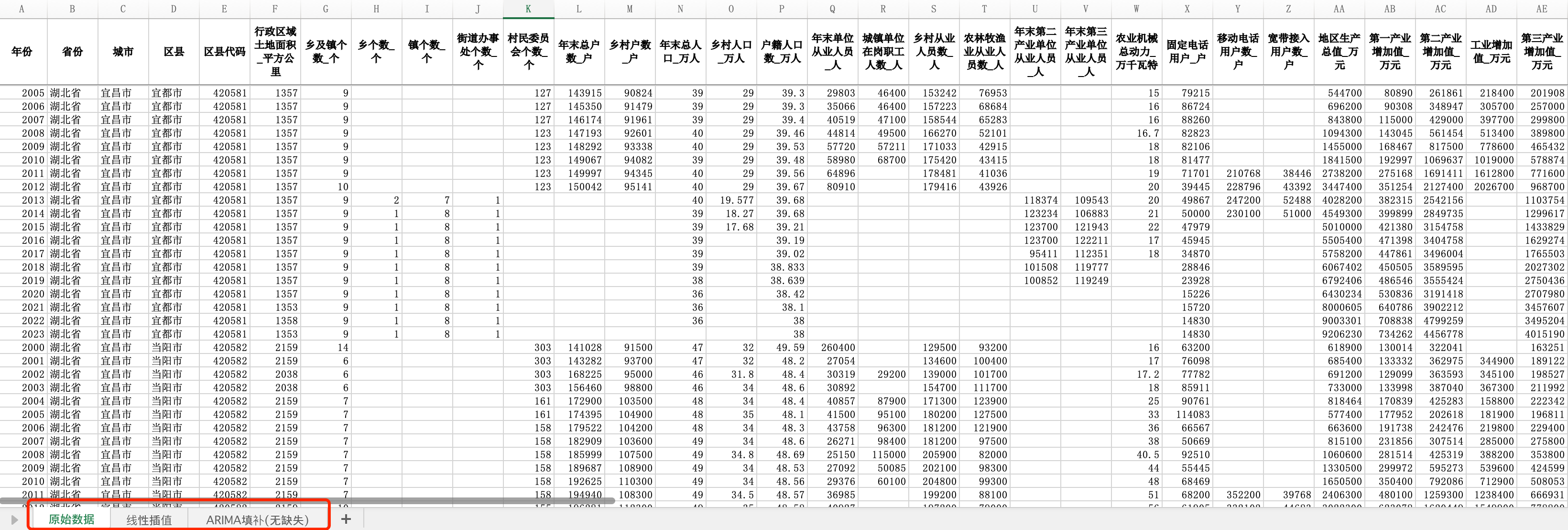 一、数据背景本数据基于《中国区域经济统计年鉴》《中国县域统计年鉴》等官方资料,系统整合了2000-2023年县级行政单位的经济、人口、农业、教育、卫生、投资、能源等80项指标。为确保数据连续性与可用性,采用线性插值与ARIMA模型进行缺失值填补,转化为完整的平衡面板数据,同时保留原始数据版本,满足不同研究需求。