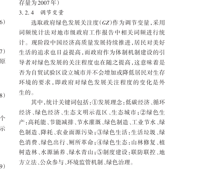2.测算方式:参考顶刊《中国人口·资源与环境》选取政府绿色发展关注度(GZ)作为调节变量,采用词频统计法对地市级政府工作报告中相关词频进行统计。现阶段中国经济高质量发展持续推进,居民对美好生活的追求也日益提高,而政府作为体制机制建设的引导者对绿色发展的关注程度也在随之提高,这意味着是否为自贸试验区设立城市并不会增加或降低居民对生存环境的要求,即政府对绿色发展关注程度的变化是外生的。其中,统计关键词包括:①发展理念:低碳经济、循环经济、绿色经济、生态文明示范区、生态城市;②绿色生产:高耗能、节能减排、节水灌溉、绿色制造、工业节水、绿色制造、降耗、农业面源污染;③绿色生活:生活垃圾、绿色消费、绿色出行、厕所革命;④绿色生态:山林修复、植树造林、水源涵养、绿水青山;⑤制度建设:联防联控、地方立法、公众参与、环境监管机制、绿色治理