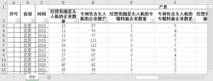 经营范围是无人机的企业数量 专利包含无人机的企业数量 经营范围是无人机的专精特新企业数量 专利包含无人机的专精特新企业数量 经营范围是无人机的高新技术企业数量 专利包含无人机的高新技术企业数量 颁证机场数量(插值) policy(政策颁布 low(政策试点 低空经济产业链上游企业数量 低空经济产业链中游企业数量 低空经济产业链下游企业数量
