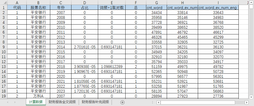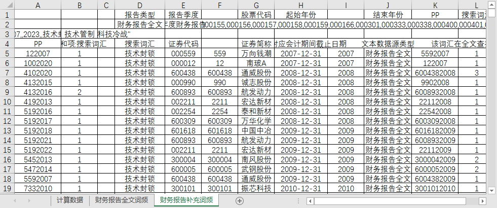 代码 股票名称 年份 占比 词频+1取对数 总 cnt_word cnt_word_ex_num cnt_word_ex_num_eng cnt_word cnt_word_ex_num cnt_word_ex_num_eng 总 补充词频 贸易保护主义 抬头 非关税壁垒 贸易壁垒 贸易摩擦 磨擦 禁运 特保 国际制裁 经济制裁 出口管制 反倾销 外汇管制 核危机 禁令 公约 强制性 制裁 法令 保护主义 报告对应会计期间截止日期 文本数据源类型 文本数据源类型 该词汇在全文查找中的词频