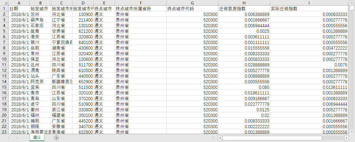日期 始发城市 始发城市所属省份 始发城市代码 终点城市 终点城市所属省份 终点城市代码 迁徙意愿指数 实际迁徙指数 数据整理 整理时间