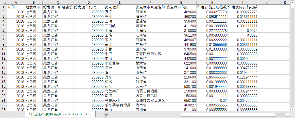 年份 始发城市 始发城市所属省份 始发城市代码 终点城市 终点城市所属省份 终点城市代码 年度迁徙意愿指数 年度实际迁徙指数