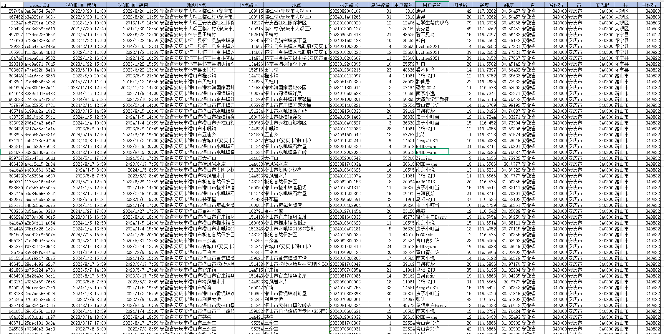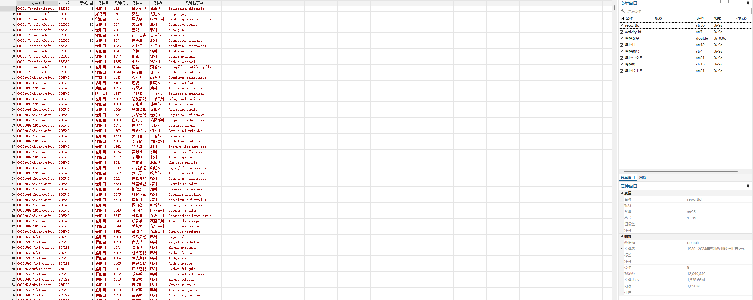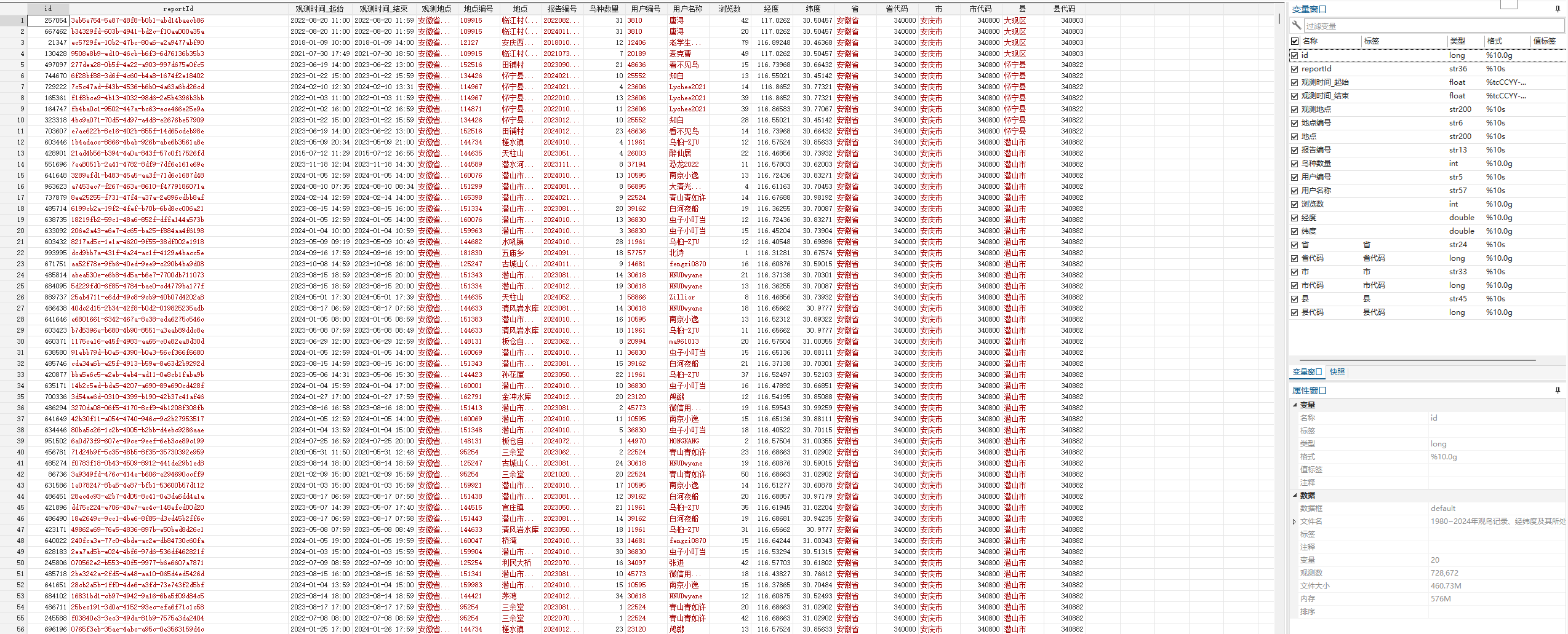 1980-2024年全国各省市区县观鸟记录面板数据及统计数据观测时间地点编号鸟种数量等