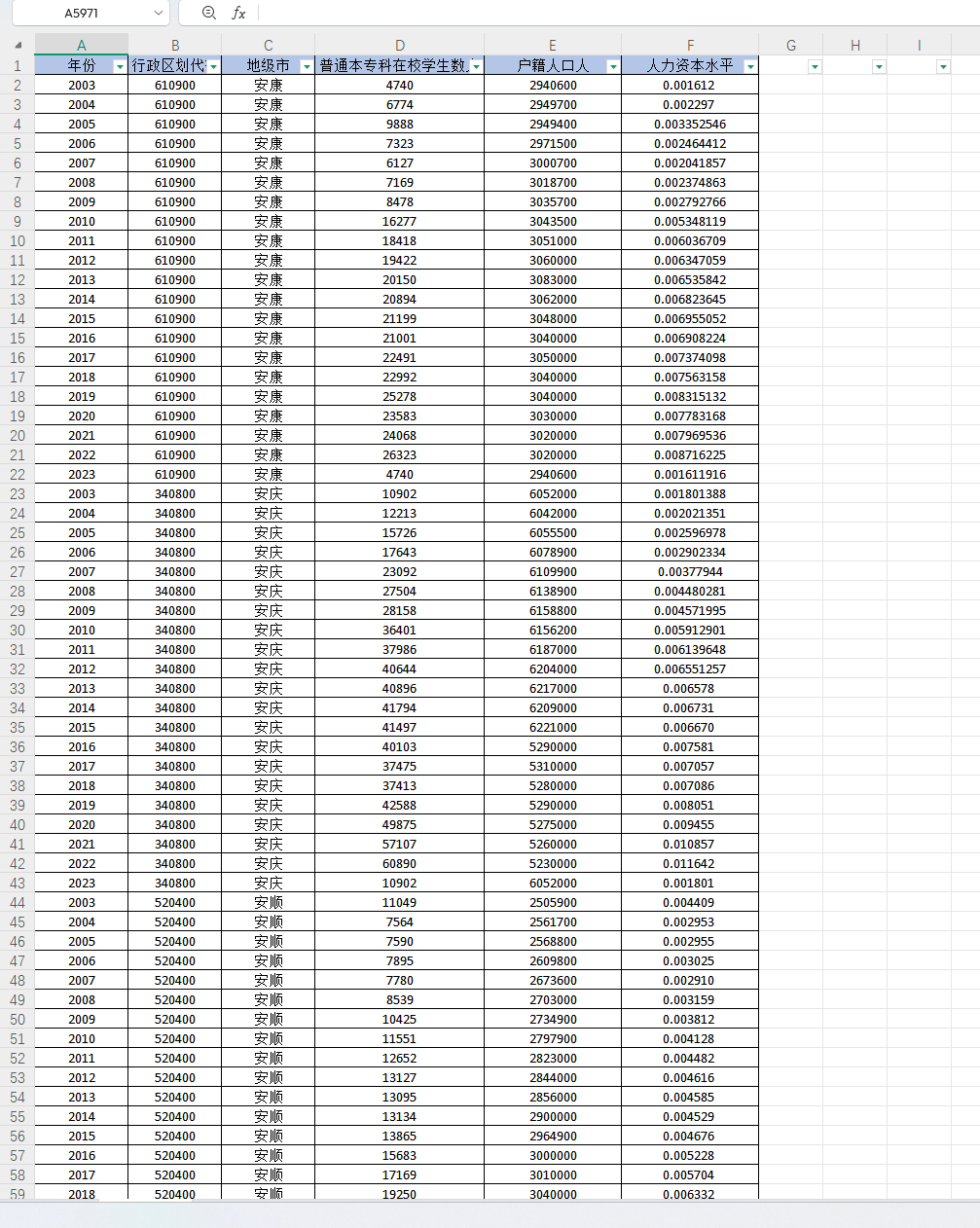 年份、行政区划代码、地级市、普通本专科在校学生数人、户籍人口数、人力资本水平