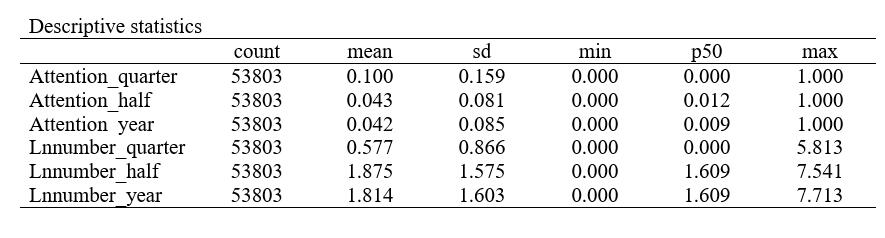 首先,本文参考姜广省等 (2021),用绿色投资基金作为绿色机构投资者的代表,在基金持股数据里,如果基金的产品名称、投资目标或业绩基准或投资理念含ESG、社会责任、道德责任、绿色、环保、低碳、美丽中国、公司治理、可持续发展等关键词,则认定该基金投资者为绿色机构投资者。其次,根据基金持股数据计算出W和W_IND,然后在每一季度对每一家上市企业的所有绿色机构投资者 i 进行加总得到 Attention。最后,在年份层面对季度Attention进行算术平均得到绿色机构投资者注意力指标。本文还采用绿色机构投资者数量(取对数)来衡量企业被绿色机构投资者关注的程度,用Lnnumber表示。稳健性检验计算Attention和Lnnumber指标时分别采用半年度平均方法、年末数据。
