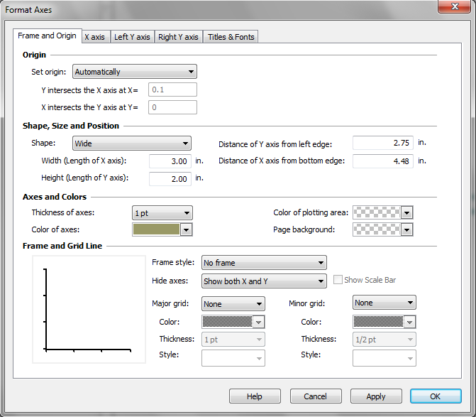 指定图表在页面上的精确位置:点击Prism工具栏中的“格式化坐标轴”工具,然后在“格式化坐标轴”对话框的“框架与原点”选项卡中,输入图表距页面顶部和左侧边缘的精确距离。