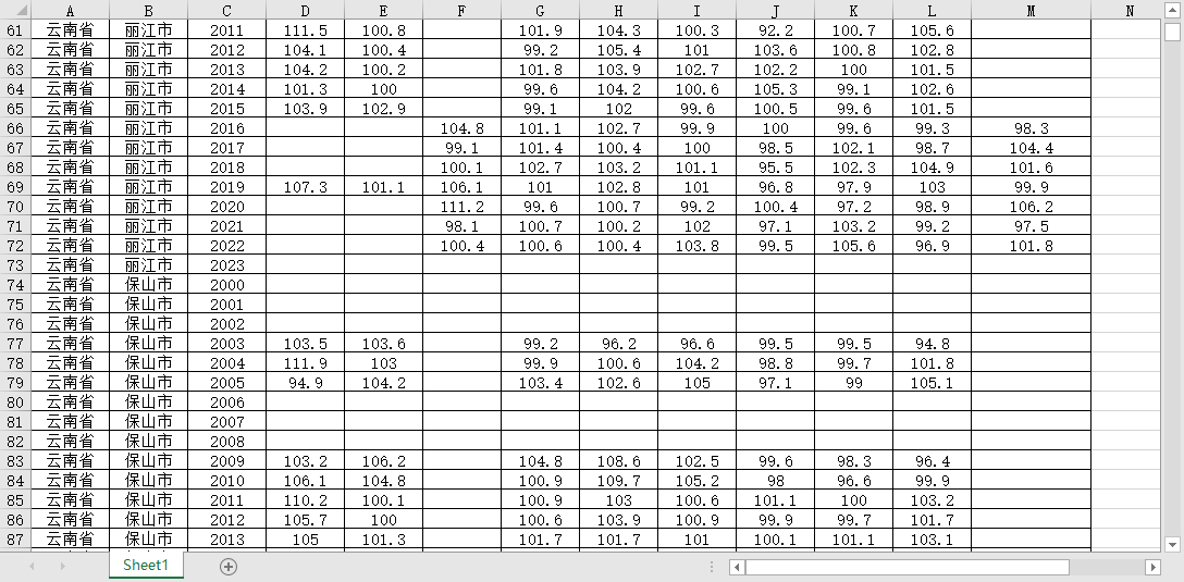 省份 地级市 年份 CPI_食品 CPI_烟酒 CPI_食品烟酒 CPI_生活用品及服务 CPI_医疗保健 CPI_教育文化娱乐 CPI_衣着 CPI_交通通信 CPI_居住 CPI_其他用品及服务