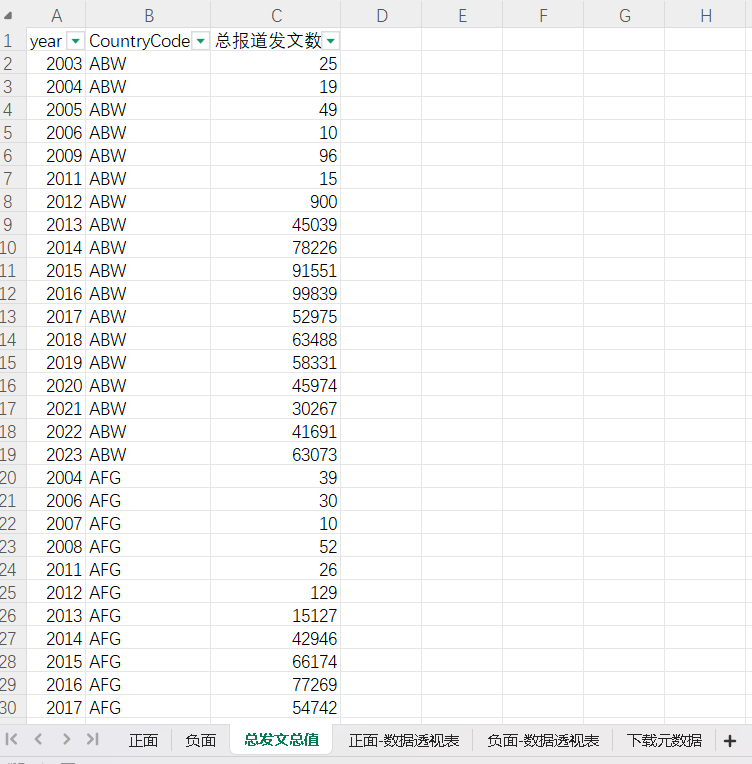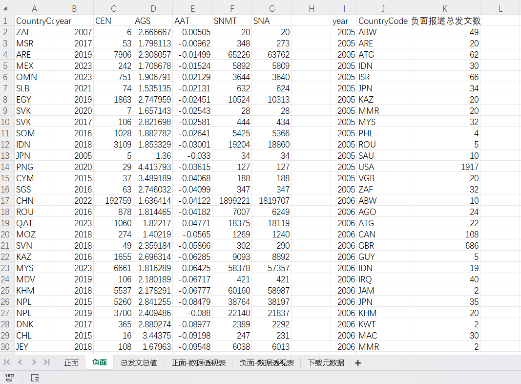 【介绍】GDELT数据库(全球事件数据库)是一个实时监测全球新闻的开放平台,旨在捕捉和分析来自印刷、广播和网络媒体的事件信息。该数据库支持超过100种语言,能够识别事件中的人物、地点、组织、情感等关键要素。实时监测全球新闻,GDELT每15分钟更新一次数据,涵盖自1979年以来的数亿条事件记录,为研究人员和分析师提供了丰富的资源,以便进行社会、政治和经济趋势的分析和预测。已清洗事件发生数量、平均戈德斯坦得分、平均语调年度均值、总提及次数、总发文数量(均是对中国)。