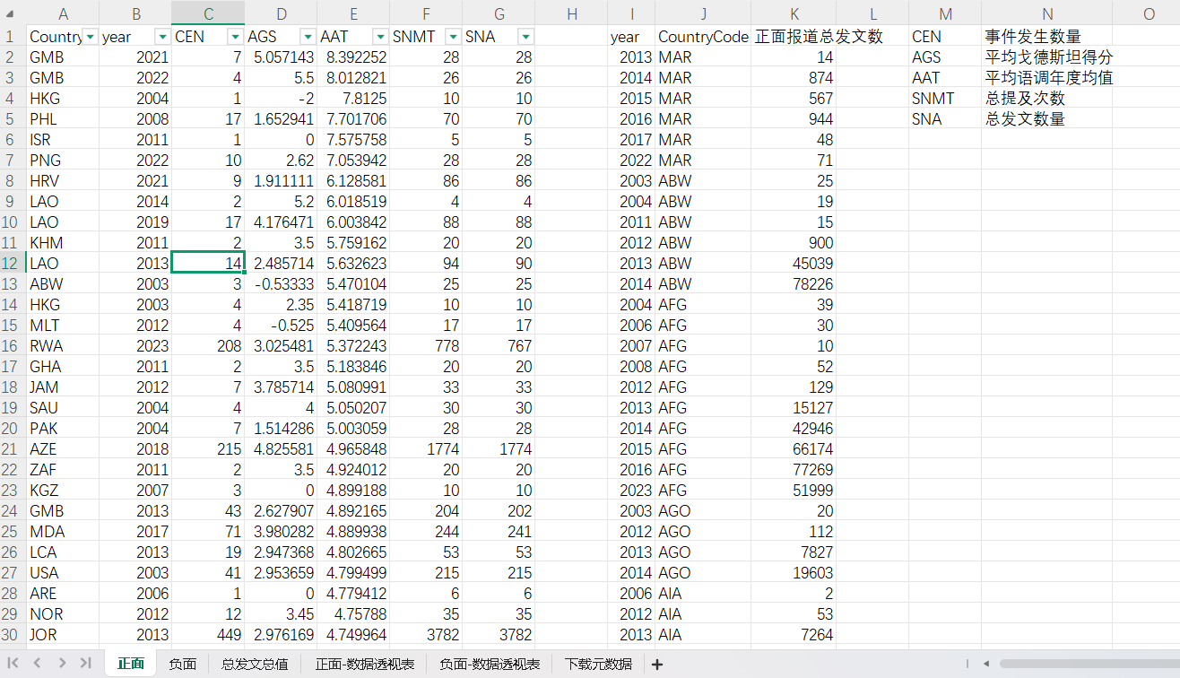 已清洗数据包括事件发生数量、平均戈德斯坦得分、年度语调均值等,均针对中国!