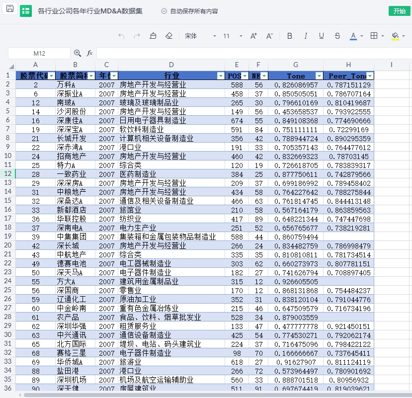 股票代码 | 股票简称 | 年份 | 行业 | POST | NEG | Tone | Peer_Tone