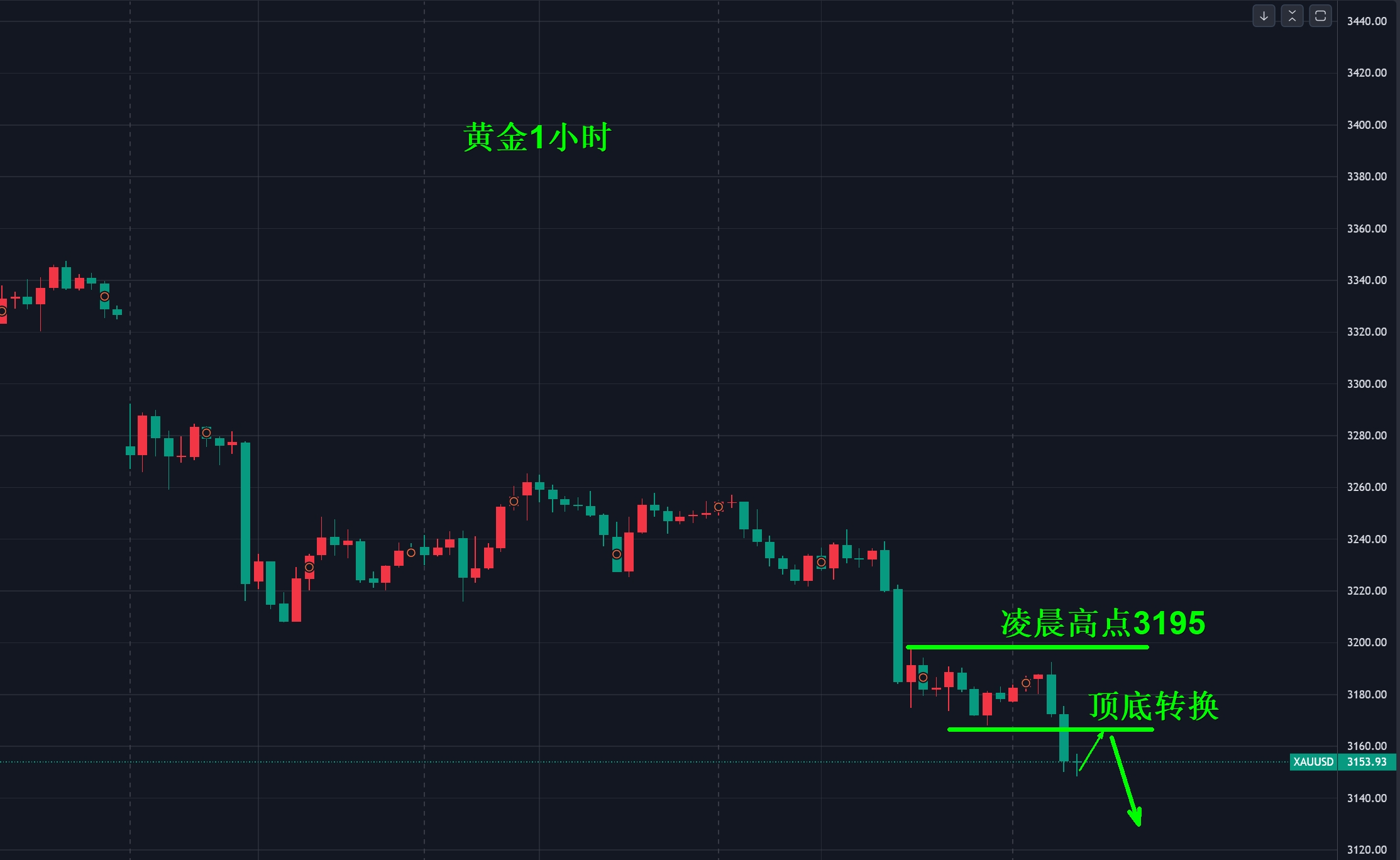 还有,今天早上属于:前日弱势底部收,次日早盘仍可空,今天早上的压力位置在3195美元附近,反弹压力是凌晨高点的位置,然后向下破位到达3150美元,而这个时候关键的压力是顶底转换。