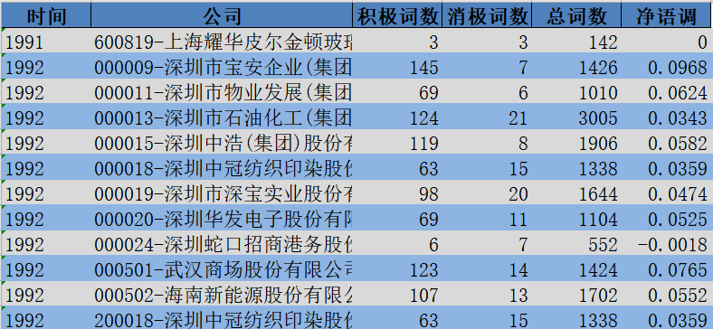 我们基于A股上市公司年报的文本数据,参考中文金融情感词典_姜富伟等(2020),首先采用 Python 开放源“结巴”中文分词模块对年报全文文本进行自动分词,参考哈工大停用词表,过滤掉年报文本中的停用词(即提取有效词汇),然后进行积极词和消极词的词频统计。统计时利用否定词词表,考虑到语意反转现象,若积极词前紧跟着否定词,则统计为消极词,反之亦然。最后参照Davis 等