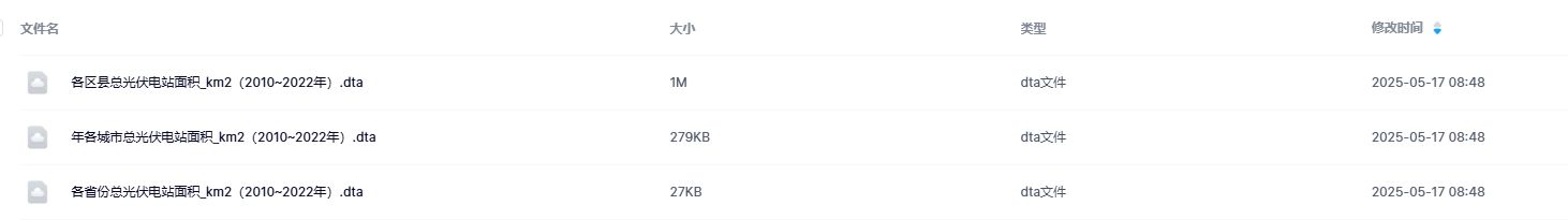 三、数据概览1、中国各省市县总光伏电站面积数据文件概览(dta格式)