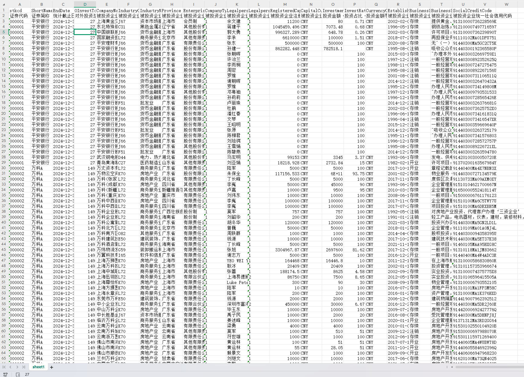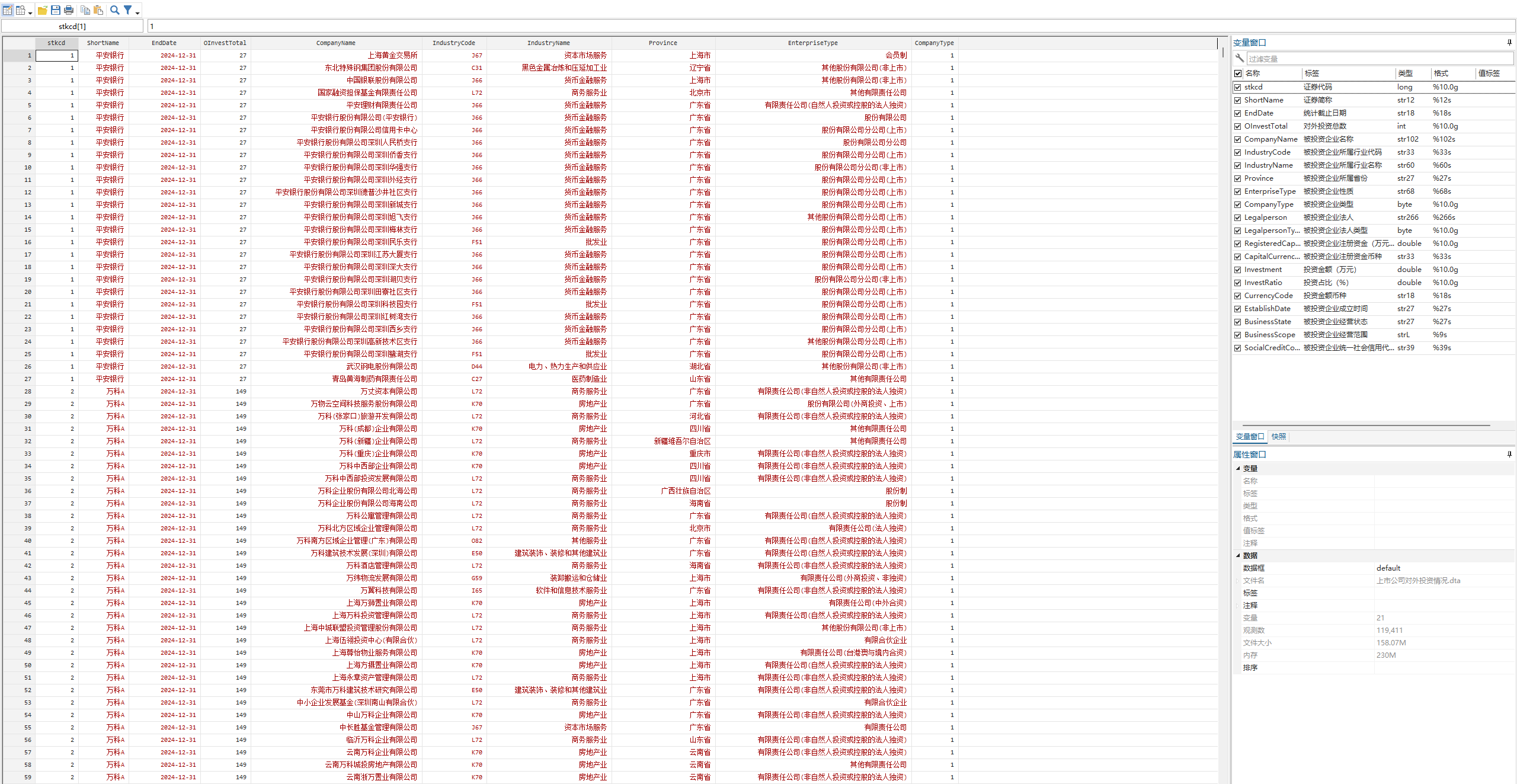 ▪ 综合评价: 上市公司对外投资情况数据是研究企业战略布局、产业经济与资本市场互动的重要资源。从企业微观层面,该数据可帮助学者探究上市公司多元化投资策略与绩效关系,通过 “投资金额”“投资占比” 等变量分析企业资源配置效率,结合 “被投资企业经营状态” 判断投资风险与收益特征;在产业经济领域,基于 “被投资企业所属行业代码” 和 “所属省份” 变量,能够剖析产业协同效应、区域经济发展差异及产业转移路径;对资本市场研究而言,“证券代码”“证券简称” 与投资数据的关联,有助于分析企业对外投资行为对股价波动、市值管理的影响;而 “被投资企业性质”“企业类型” 等变量,为研究混合所有制改革、市场主体互动机制提供了实证依据。该数据体系完整、变量丰富,为管理学、经济学等多学科交叉研究提供了坚实的数据基础,能够推动企业投资理论与实践应用的深化。