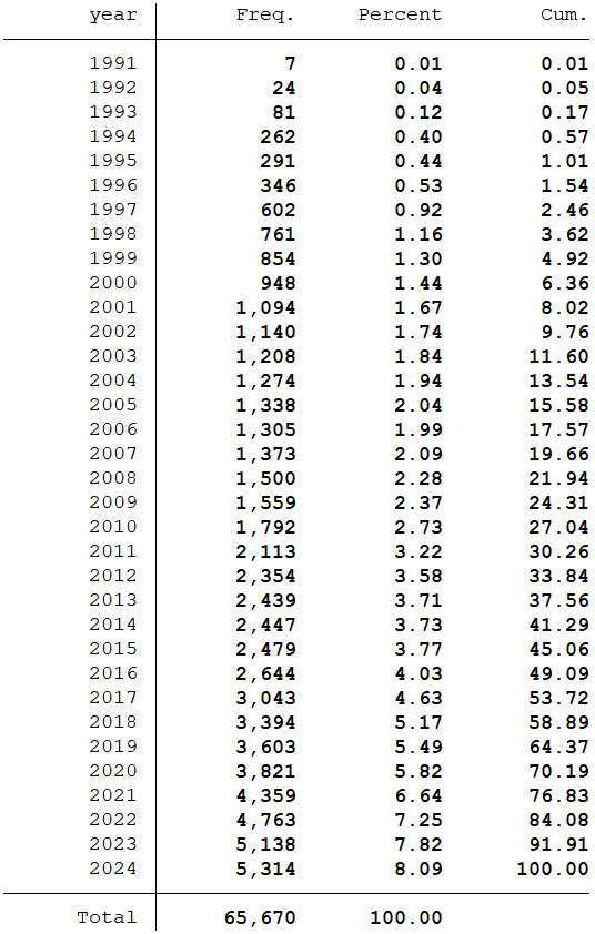 样本选择:全部A股1991-2024年数据(“周个股回报率文件”和“综合周市场回报率文件”在数据库中均是从1990-51开始,经过处理之后的数据起点为1991年)