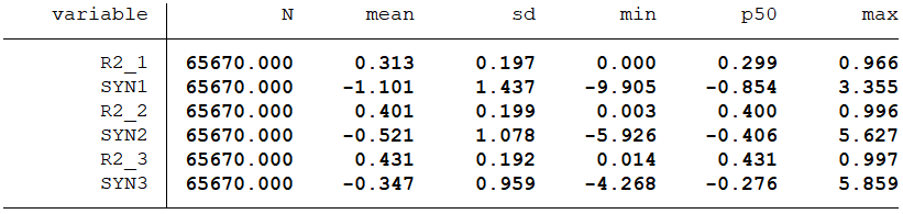 SYN1、SYN2、SYN3分别对应模型(1)、模型(2)、模型(3)计算得到的拟合优度R2进行如模型(4)的对数化处理进而计算得到的股价同步性
