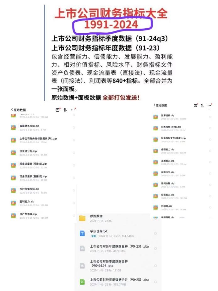 注意:此数据为a股上市公司财务面板数据,发全部年份,不是a股没有。单找个别企业的确认是否为a股,年份一般为上市后年份到2024年。一共840指标 具体指标内容看下面截图。原始数据为excel格式,840指标合并版本有excel格式和dta格式