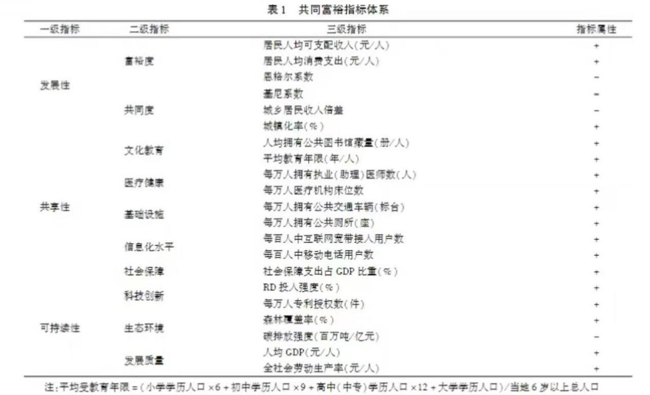 测算方式:参考C刊《软科学》韩亮亮老师的做法,本文从共同富裕内涵出发,在参考相关文献的基础上,结合省际层面数据可得性,从共同富裕的发展性、共享性和可持续性三方面构建出指标的共同富裕评价指标体系。 对于三级指标的选择,在把握共同富裕的核心指标基础上,为考虑避免指标相关性过高和遗漏重要指标,最终选择指标(下图)。 为避免主观赋权的弊端以及多指标数据重叠问题,本文选择使用熵值法对共同富裕评价指标进行赋权,得到各个省份的共同富裕发展指数