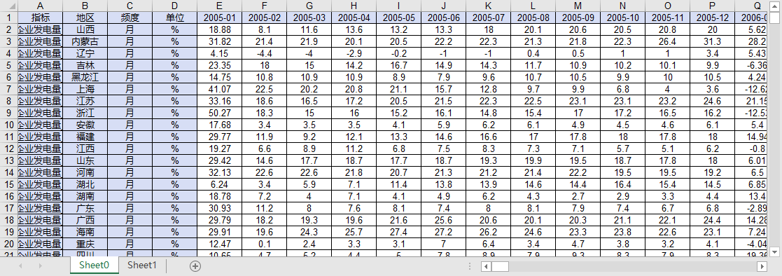 全国分省份水力火力风力核能发电量煤气液化石油天然气产量当期累计同比增速2005-202503月度增长率数据