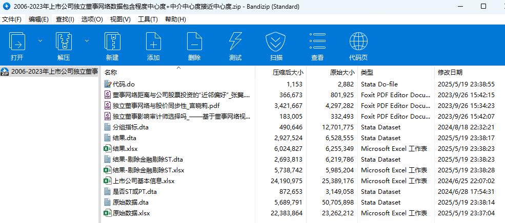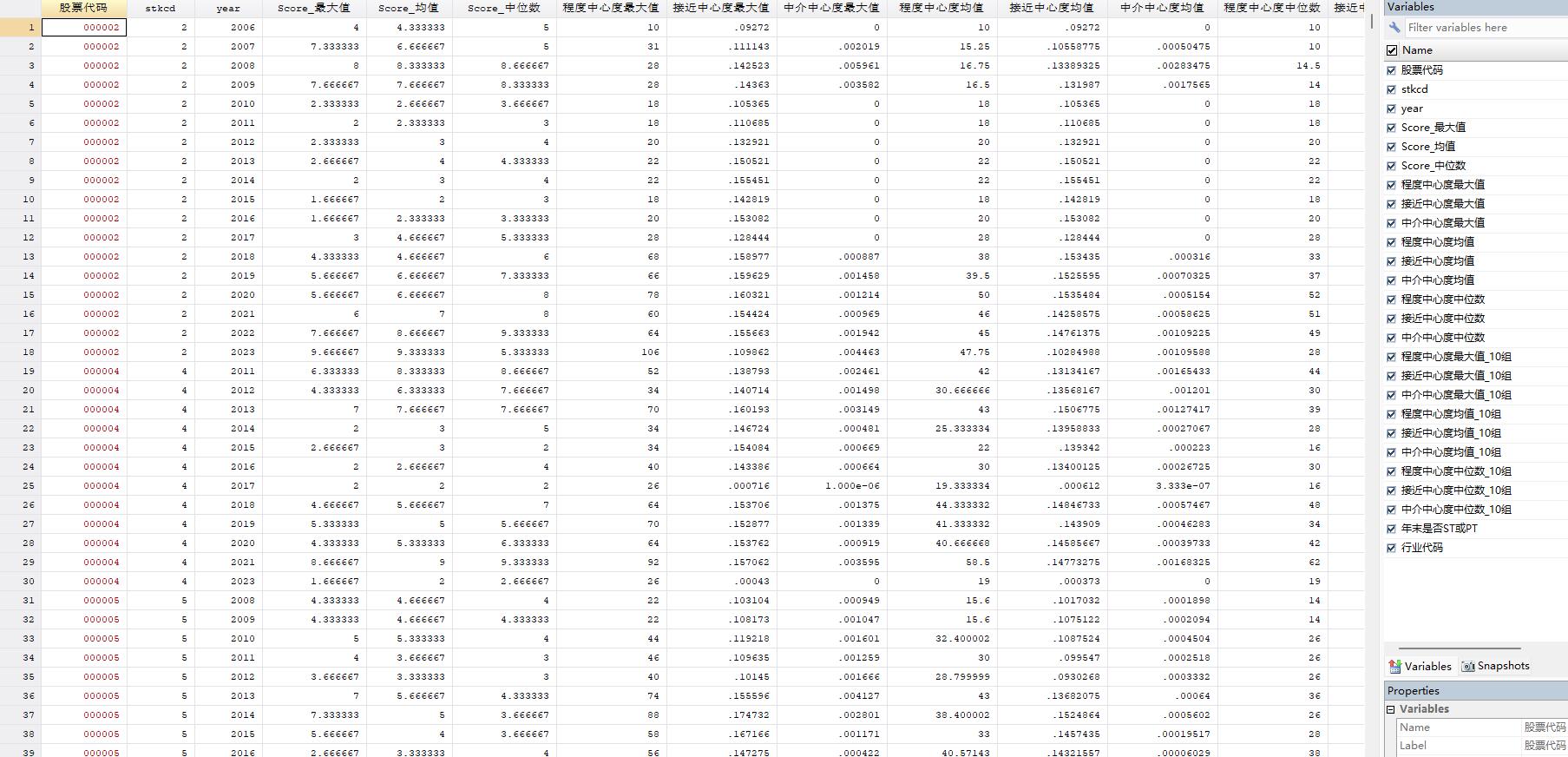 我们参考谢德仁和陈运森(2012) ,用程度中心度(Degree) 、中介中心度( Betweenness)、接近中心度(Closeness) 三个指 标刻画独立董事在网络中的位置。用pajek计算所有董事的三个中心度指标; 只保留公司的独立董事中心度数据,以公司为单位,取独董中的最大值作为公司中心度指标,同时采用平均值和中位数进行稳健性检验; 考虑到三个指标分别反应了董事中心度程度的不同侧面,为了全方面衡量中心度,消除每个中