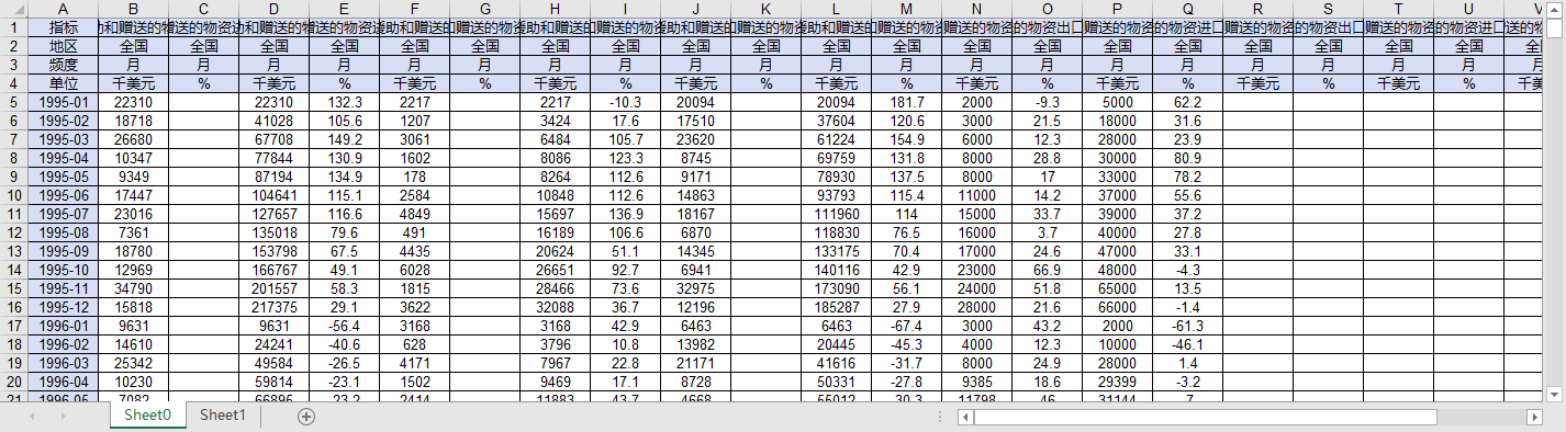 指标 国家间、国际组织无偿援助和赠送的物资进出口总额(美元)_当期 国家间、国际组织无偿援助和赠送的物资进出口总额(美元)_当期同比增速 国家间、国际组织无偿援助和赠送的物资进出口总额(美元)_累计 国家间、国际组织无偿援助和赠送的物资进出口总额(美元)_累计同比增速 国家间、国际组织无偿援助和赠送的物资出口额(美元)_当期 国家间、国际组织无偿援助和赠送的物资出口额(美元)_当期同比增速 国家间、国际组织无偿援助和赠送的物资出口额(美元)_累计 国家间、国际组织无偿援助和赠送的物资出口额(美元)_累计同比增速 国家间、国际组织无偿援助和赠送的物资进口额(美元)_当期 国家间、国际组织无偿援助和赠送的物资进口额(美元)_当期同比增速 国家间、国际组织无偿援助和赠送的物资进口额(美元)_累计 国家间、国际组织无偿援助和赠送的物资进口额(美元)_累计同比增速 国家间、国际组织无偿援助和赠送的物资出口额(美元)_国有企业_累计 国家间、国际组织无偿援助和赠送的物资出口额(美元)_国有企业_累计同比增速 国家间、国际组织无偿援助和赠送的物资进口额(美元)_国有企业_累计 国家间、国际组织无偿援助和赠送的物资进口额(美元)_国有企业_累计同比增速 国家间、国际组织无偿援助和赠送的物资出口额(美元)_私营企业_累计 国家间、国际组织无偿援助和赠送的物资出口额(美元)_私营企业_累计同比增速 国家间、国际组织无偿援助和赠送的物资进口额(美元)_私营企业_累计 国家间、国际组织无偿援助和赠送的物资进口额(美元)_私营企业_累计同比增速 国家间、国际组织无偿援助和赠送的物资出口额(美元)_外商投资企业_累计 国家间、国际组织无偿援助和赠送的物资出口额(美元)_外商投资企业_累计同比增速 国家间、国际组织无偿援助和赠送的物资出口额(美元)_中外合资经营企业_累计 国家间、国际组织无偿援助和赠送的物资出口额(美元)_中外合资经营企业_累计同比增速