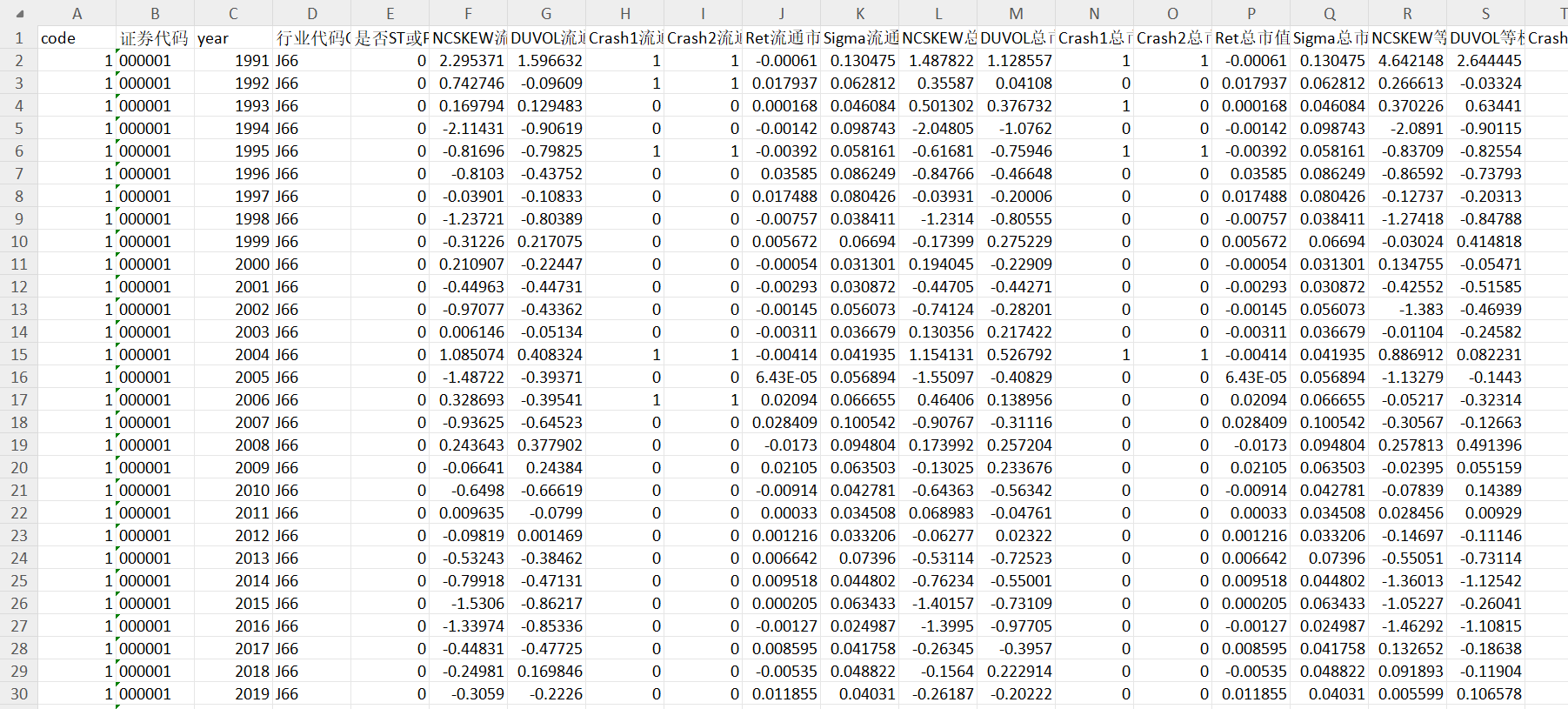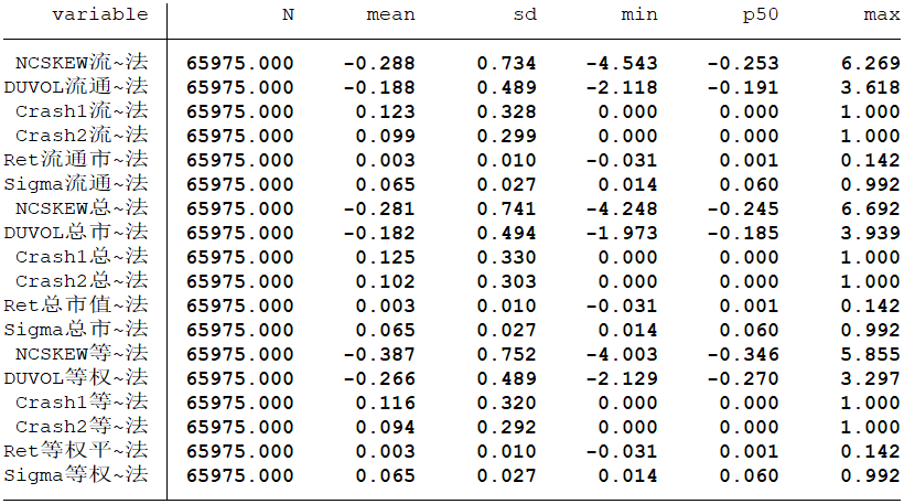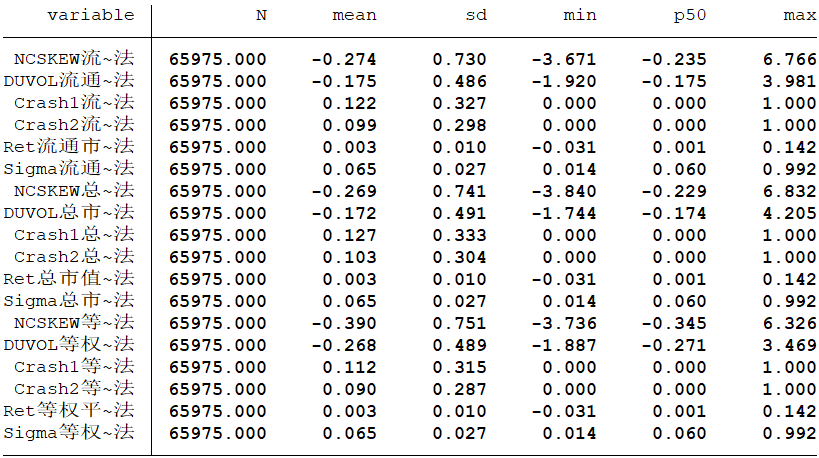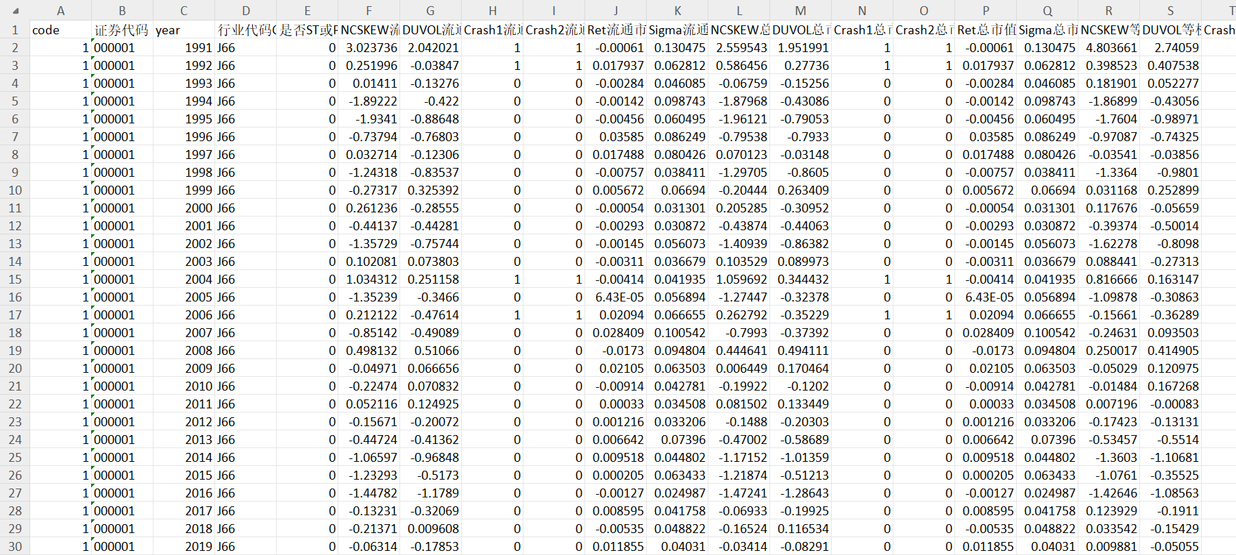 该变量的数值大小反映股票收益分布左偏的程度,股票收益越左偏,崩盘风险越大。