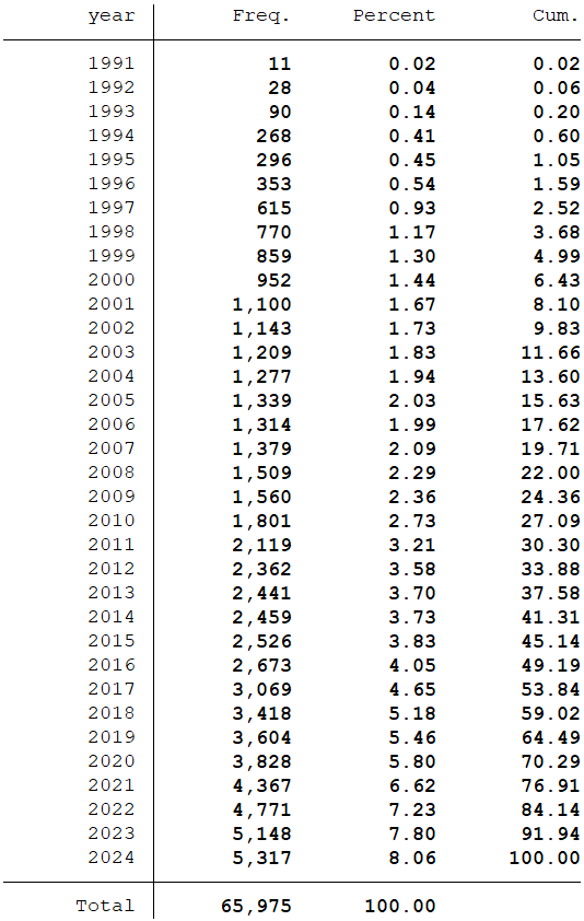 样本选择:全部A股1991-2024年数据(初始数据是从1990年开始,经过处理后的数据起点为1991年)