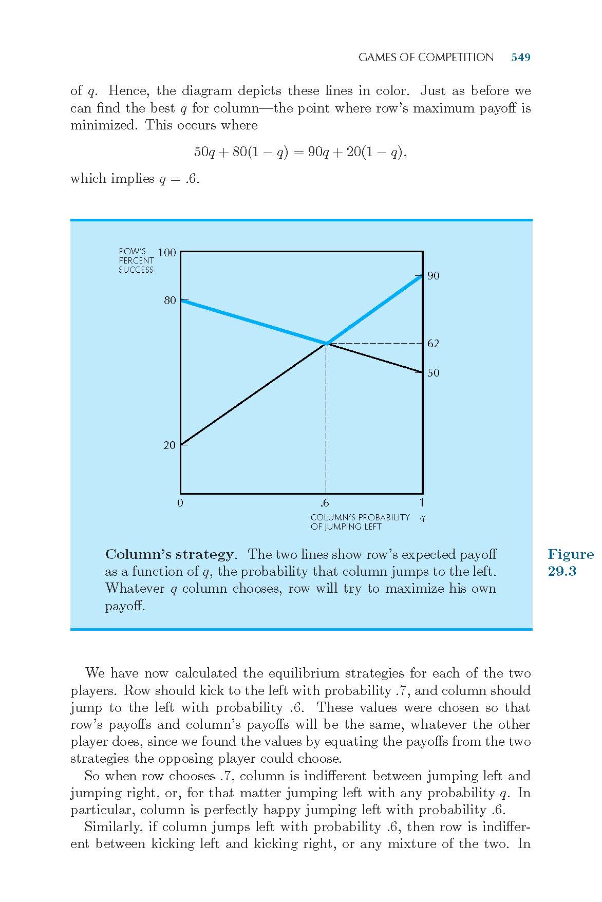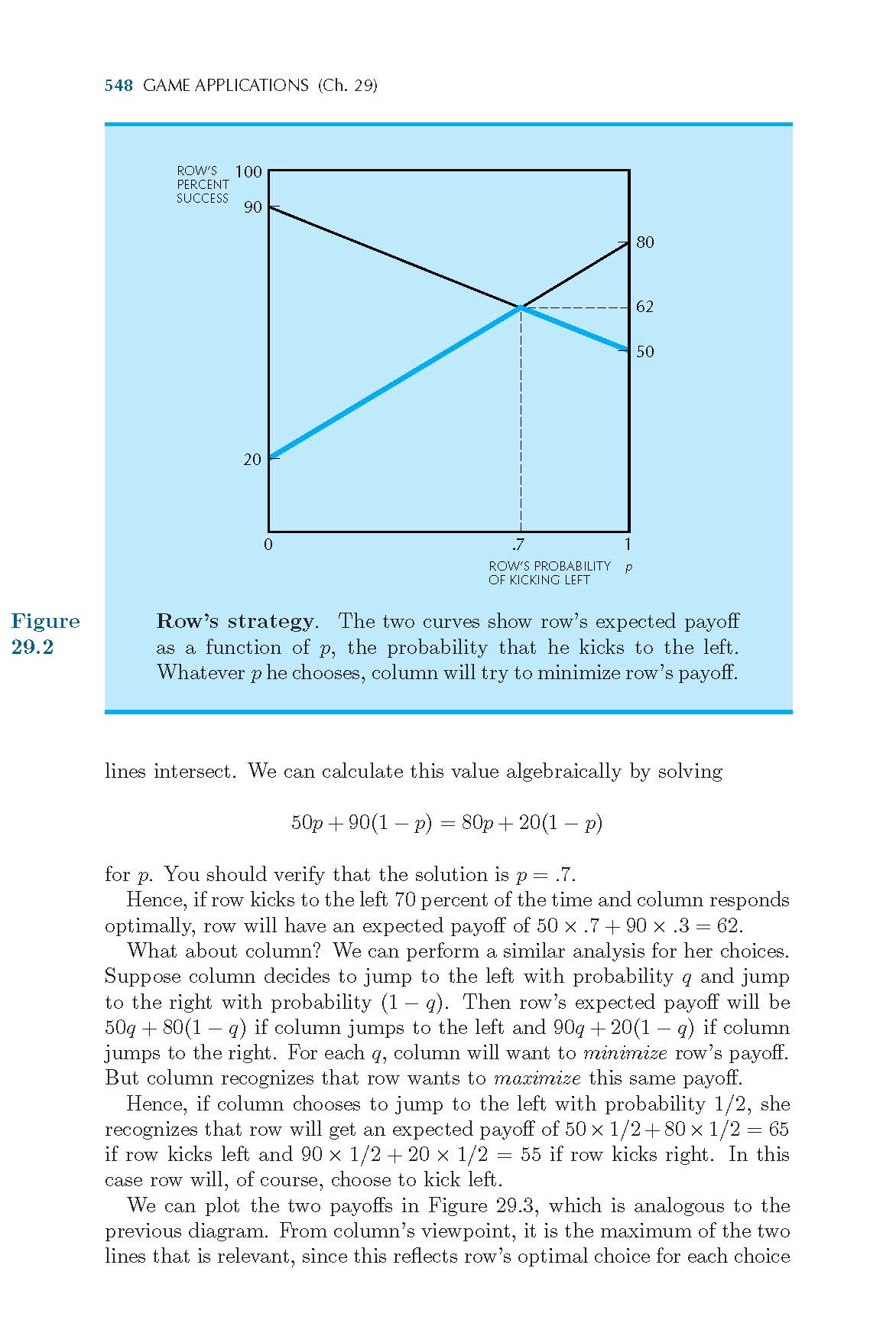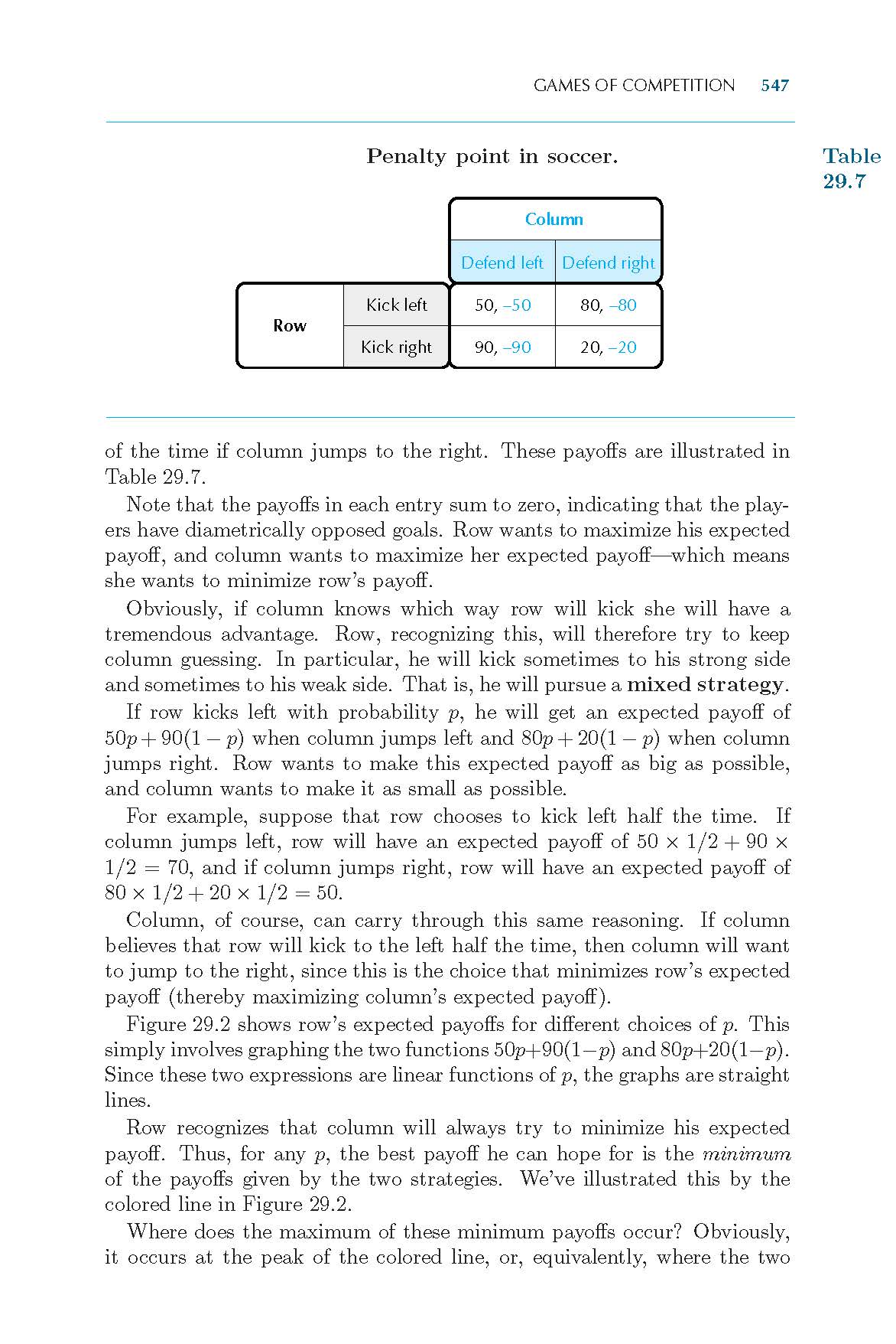 p<0.7时,根据图29.2,可知列参与人竭力使行参与人的收益最小化,应该是在在交点左边的蓝线,这条线是列扑右时,行的收益线,因此,列应该是扑右,为如什么教材中是说扑左呢?(黄色字体部分)