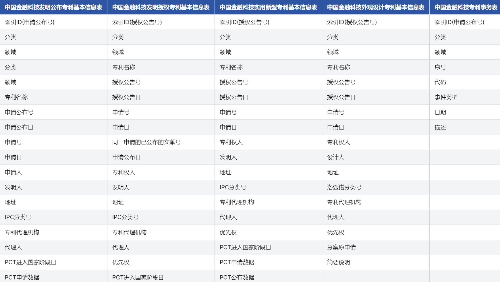 中国金融科技专利数据库是覆盖中国境内金融科技领域相关专利的数据库。是CnOpenData根据金融科技专利词典(含78个底层技术关键词及应用场景分类),以及"ABCD+"技术体系(人工智能、区块链、云计算、大数据、互联技术、安全技术)的多维度分类框架所搭建的数据库,数据采集过程严格,确保专利有效性、权属信息及技术细节的准确性。通过对接国家级专利数据库,本库可追溯专利从申请、审查到授权的全生命周期信息,包括法律状态变更、权利转移及引用关系等核心字段。