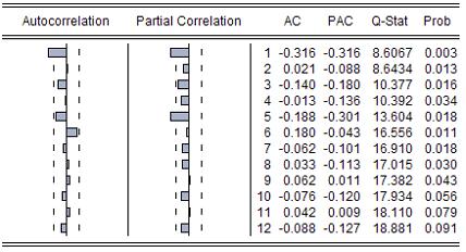 其次,考虑到是月度数据,对通过平稳性单位根检验的时间序列,做季节性单位根检验。上图是序列的自相关分析图。