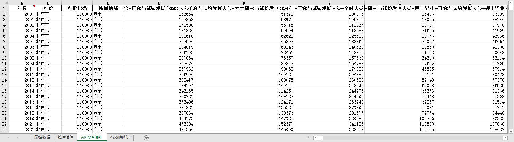 excel数据文件包原始数据(由于多年度指标不同存在缺失值)、线性插值、ARIMA填补三个版本,提供您参考使用。