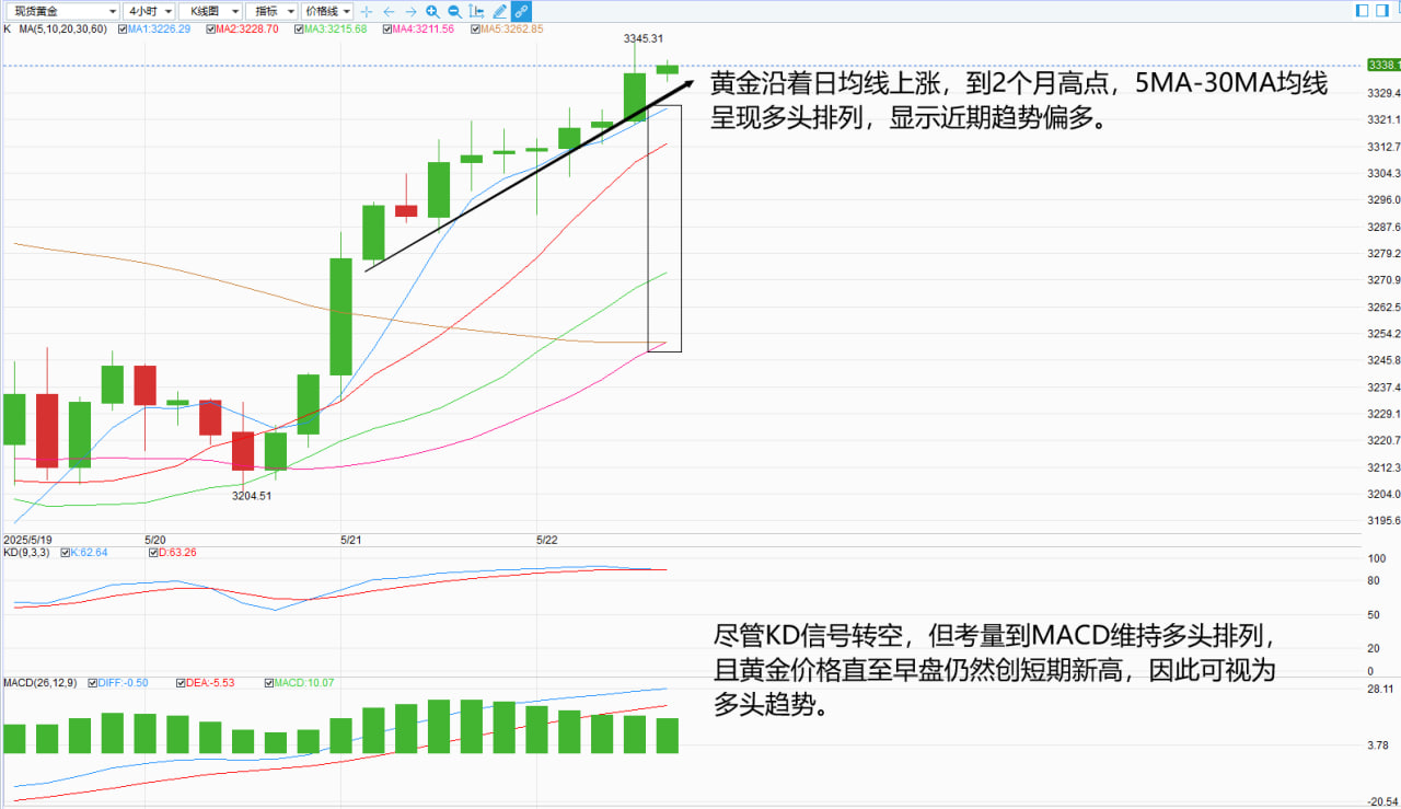 黄金涨至2周高点,日线KD信号偏多,4小时线图来看,走势沿着5MA上涨,中短期均线上湾呈现多头排列,KD与MACD信号偏多,短线可以尝试逢低布局多单。
