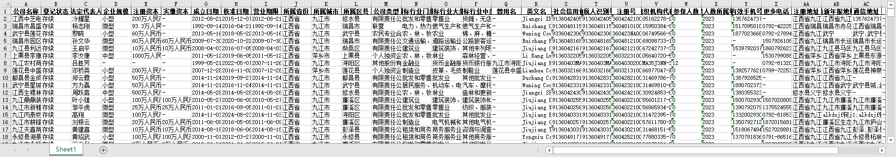 公司名称 登记状态 法定代表人 企业规模 注册资本 实缴资本 成立日期 核准日期 营业期限 所属省份 所属城市 所属区县 公司类型 国标行业门类 国标行业大类 国标行业中类 曾用名 英文名 统一社会信用代码 纳税人识别号 注册号 组织机构代码 参保人数 参保人数 所属年报 有效手机号 更多电话 注册地址 最新年报地址 通信地址 网址 邮箱 其他邮箱 经营范围