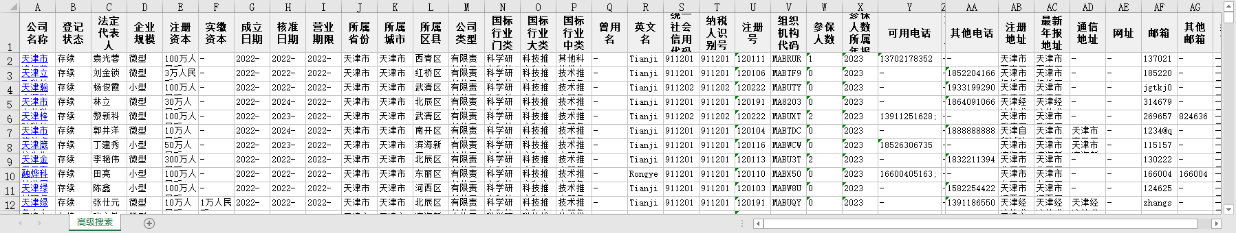 公司名称 登记状态 法定代表人 企业规模 注册资本 实缴资本 成立日期 核准日期 营业期限 所属省份 所属城市 所属区县 公司类型 国标行业门类 国标行业大类 国标行业中类 曾用名 英文名 统一社会信用代码 纳税人识别号 注册号 组织机构代码 参保人数 参保人数 所属年报 有效手机号 更多电话 注册地址 最新年报地址 通信地址 网址 邮箱 其他邮箱 经营范围