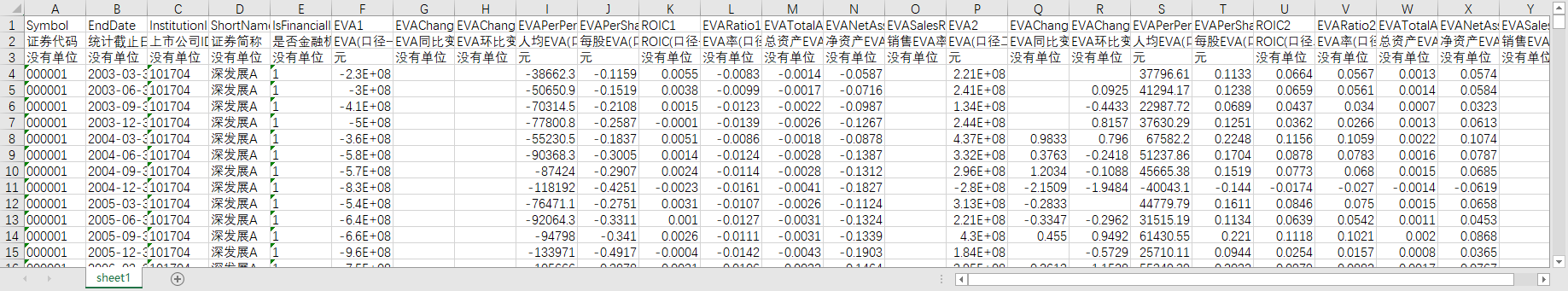 证券代码 统计截止日期 上市公司ID 证券简称 是否金融机构 EVA(口径一) EVA同比变动比例(口径一) EVA环比变动比例(口径一) 人均EVA(口径一) 每股EVA(口径一) ROIC(口径一) EVA率(口径一) 总资产EVA率(口径一) 净资产EVA率(口径一) 销售EVA率(口径一) EVA(口径二) EVA同比变动比例(口径二) EVA环比变动比例(口径二) 人均EVA(口径二) 每股EVA(口径二) ROIC(口径二) EVA率(口径二) 总资产EVA率(口径二) 净资产EVA率(口径二) 销售EVA率(口径二)