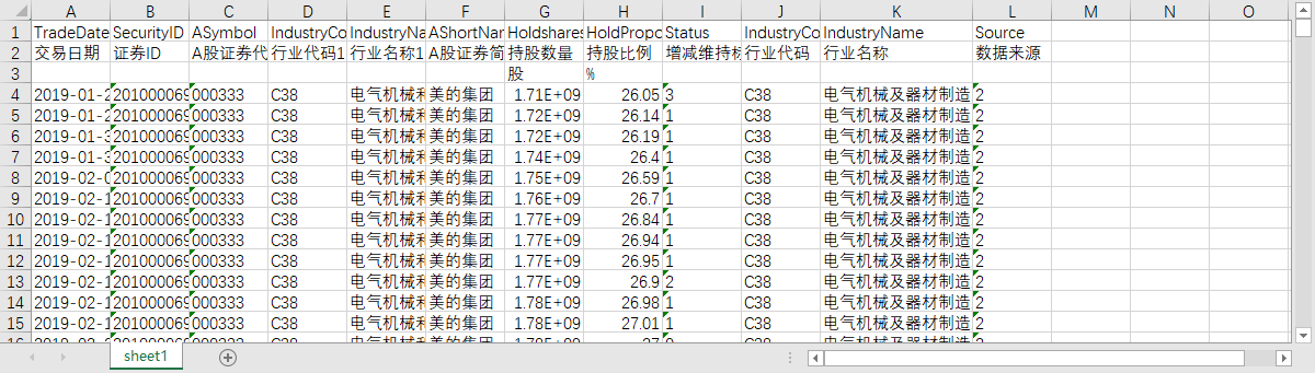 交易日期 证券ID A股证券代码 行业代码1 行业名称1 A股证券简称 持股数量 持股比例 增减维持标识 行业代码 行业名称 数据来源