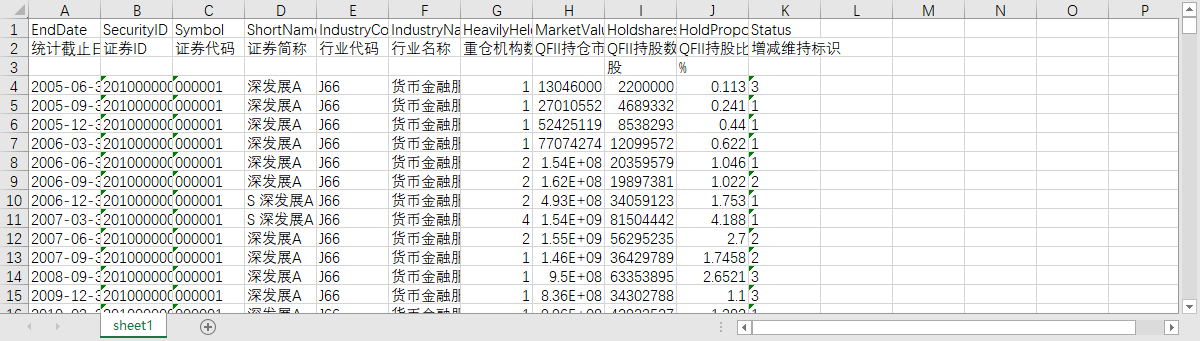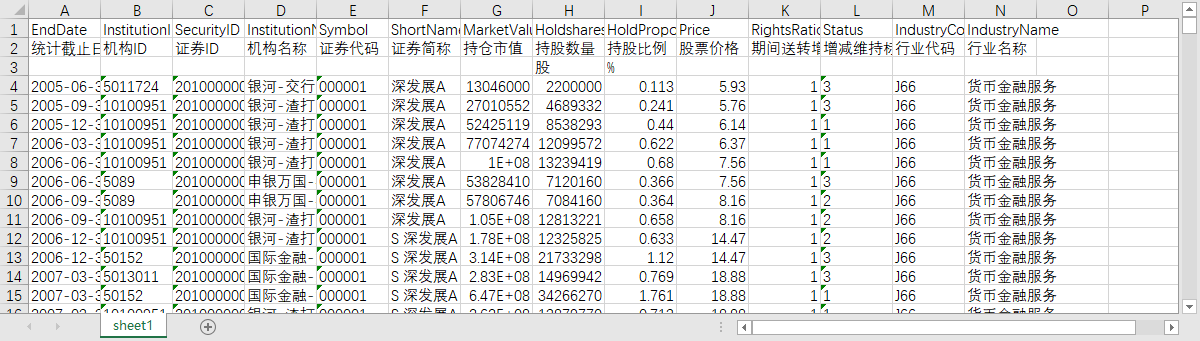 统计截止日期 机构ID 证券ID 机构名称 证券代码 证券简称 持仓市值 持股数量 持股比例 股票价格 期间送转增配股比例 增减维持标识 行业代码 行业名称